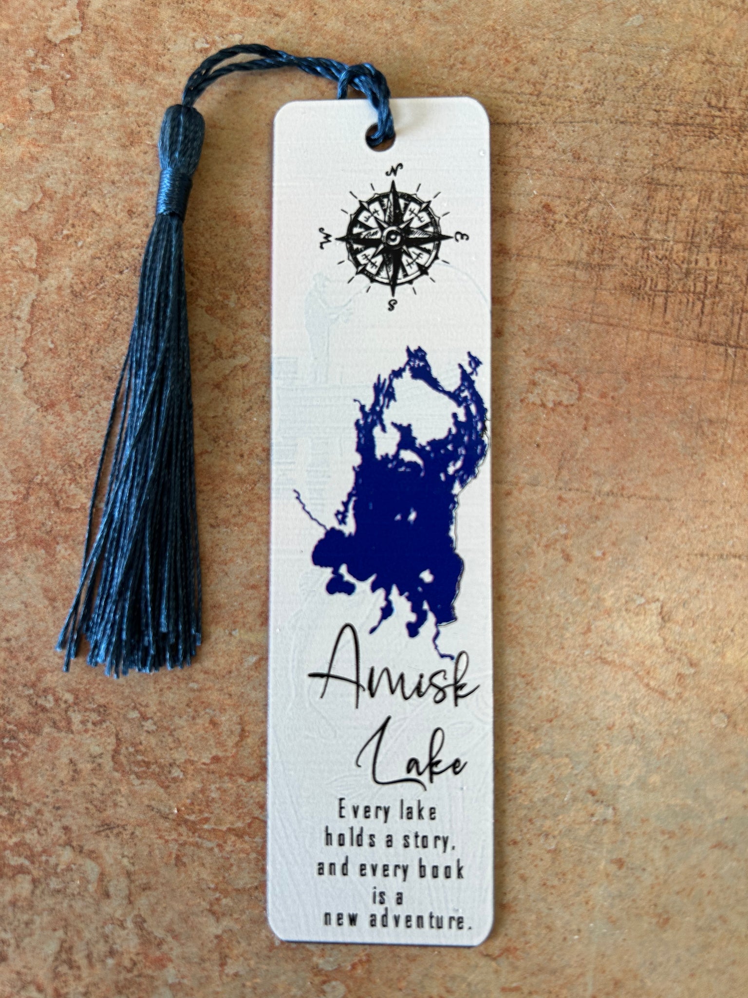• Side 1: A detailed map of Amisk Lake in bold blue, paired with a compass rose and the inspiring quote, “Every lake holds a story, and every book is a new adventure.”