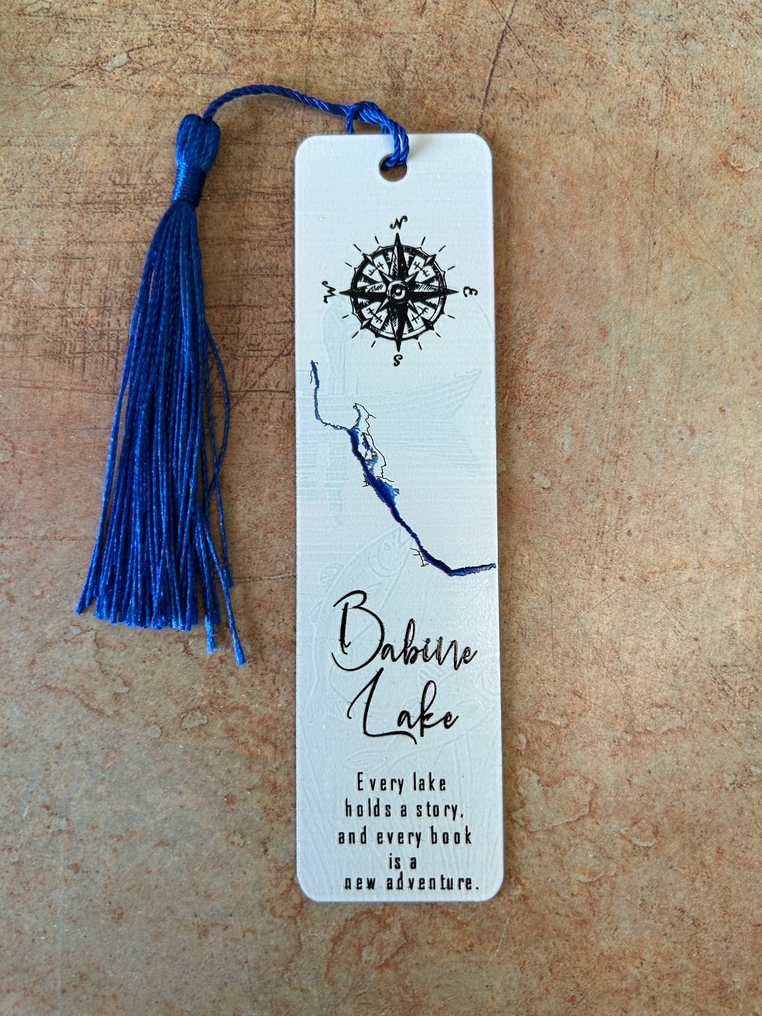 • Side 1: A detailed map of Babine Lake in bold blue, paired with a compass rose and the inspiring quote, “Every lake holds a story, and every book is a new adventure.”