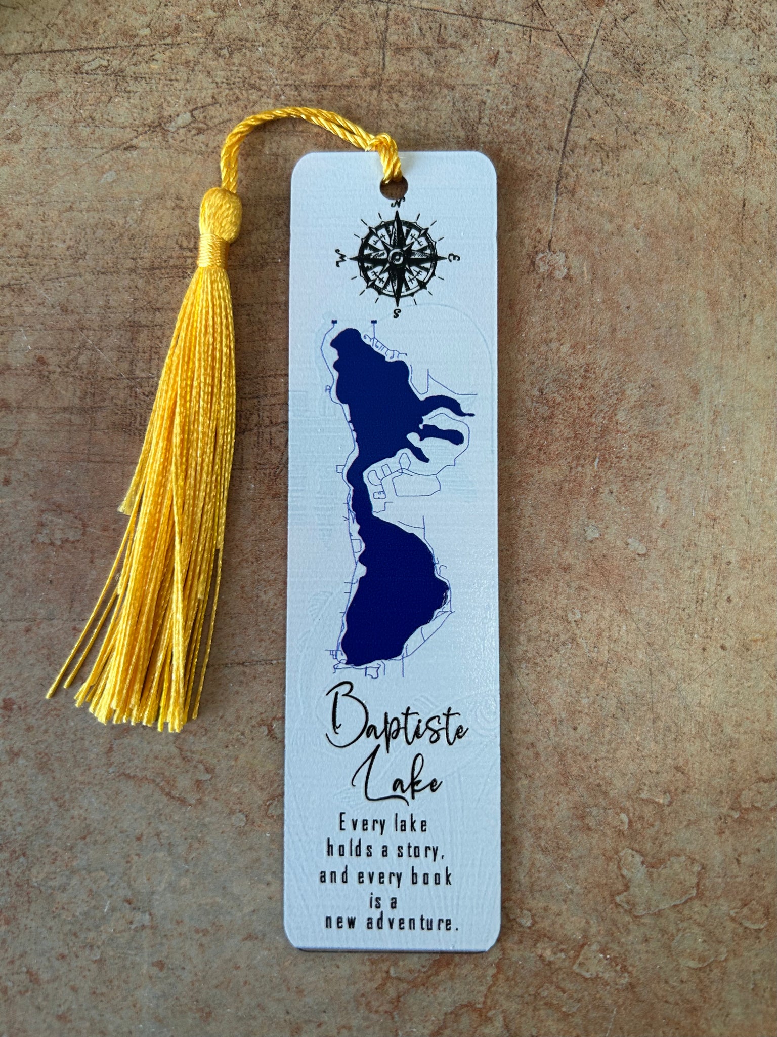 • Side 1: A detailed map of Baptist Lake in bold blue, paired with a compass rose and the inspiring quote, “Every lake holds a story, and every book is a new adventure.”