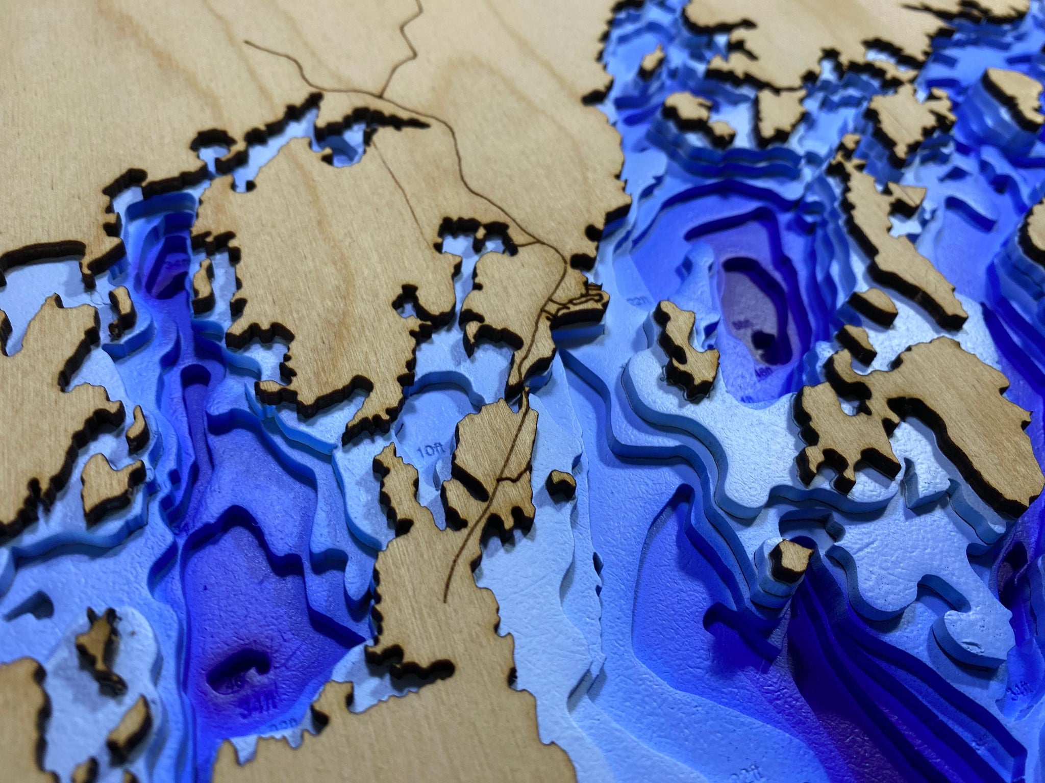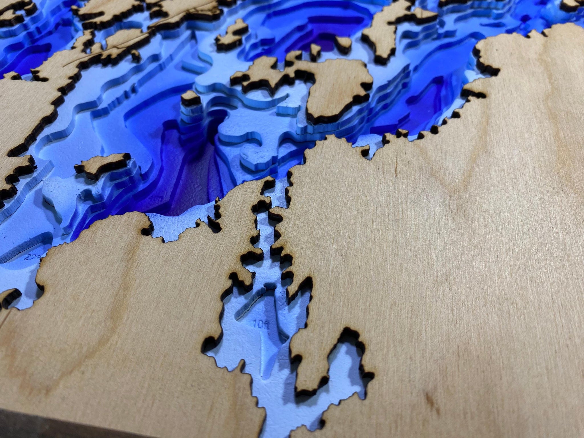 This exquisite art piece is a layered depth map of Besnard Lake , meticulously crafted to showcase the lake's bathymetry with exceptional precision and artistry. It features a combination of laser-cut wood layers and expert airbrush painting to create a stunning 3D representation of the lake's depth.
