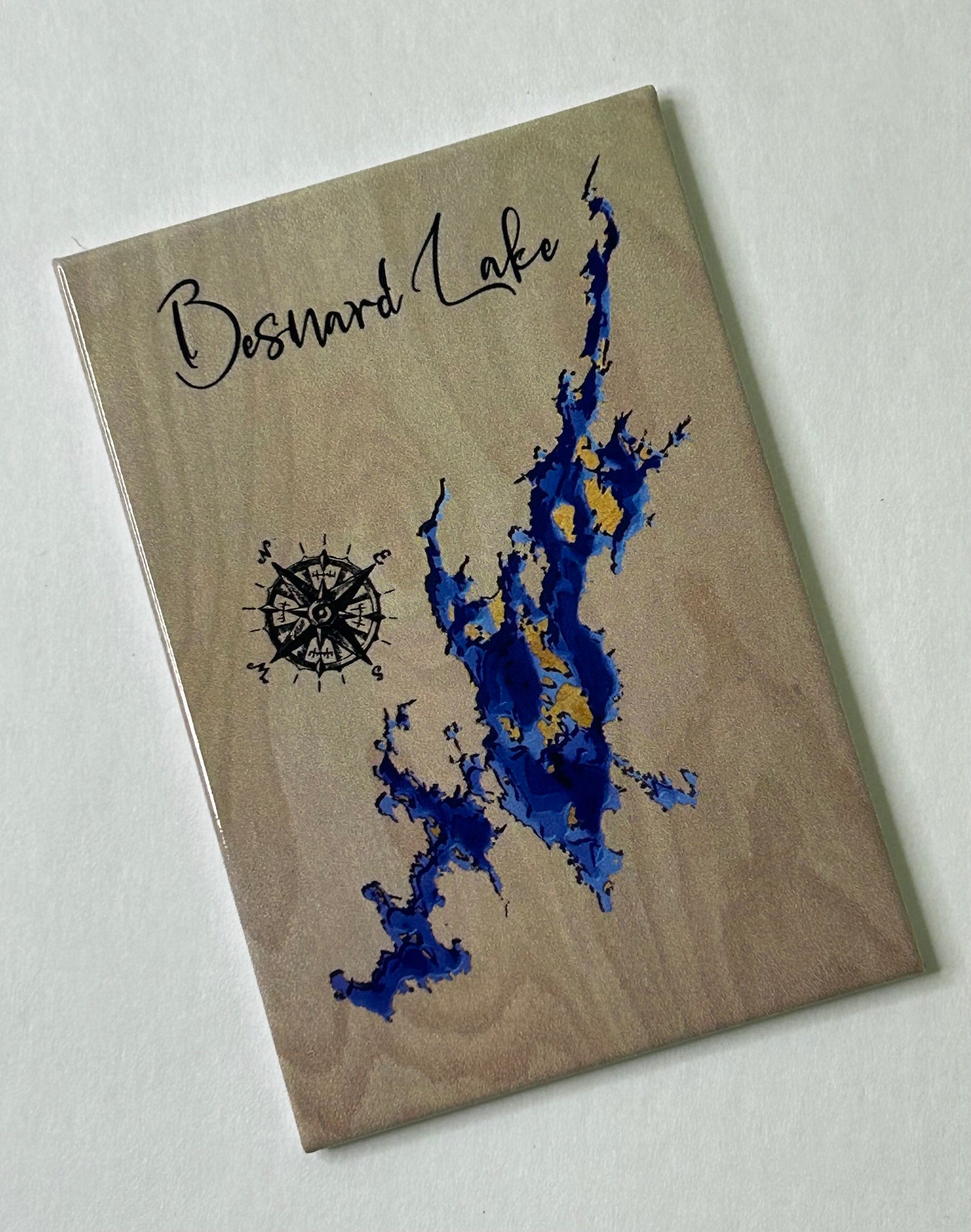 Crafted with precision using UV printing, this magnet captures the lake’s natural shape, surrounding road layout, and a decorative compass for a unique touch. The shimmering background adds a rustic yet modern appeal.