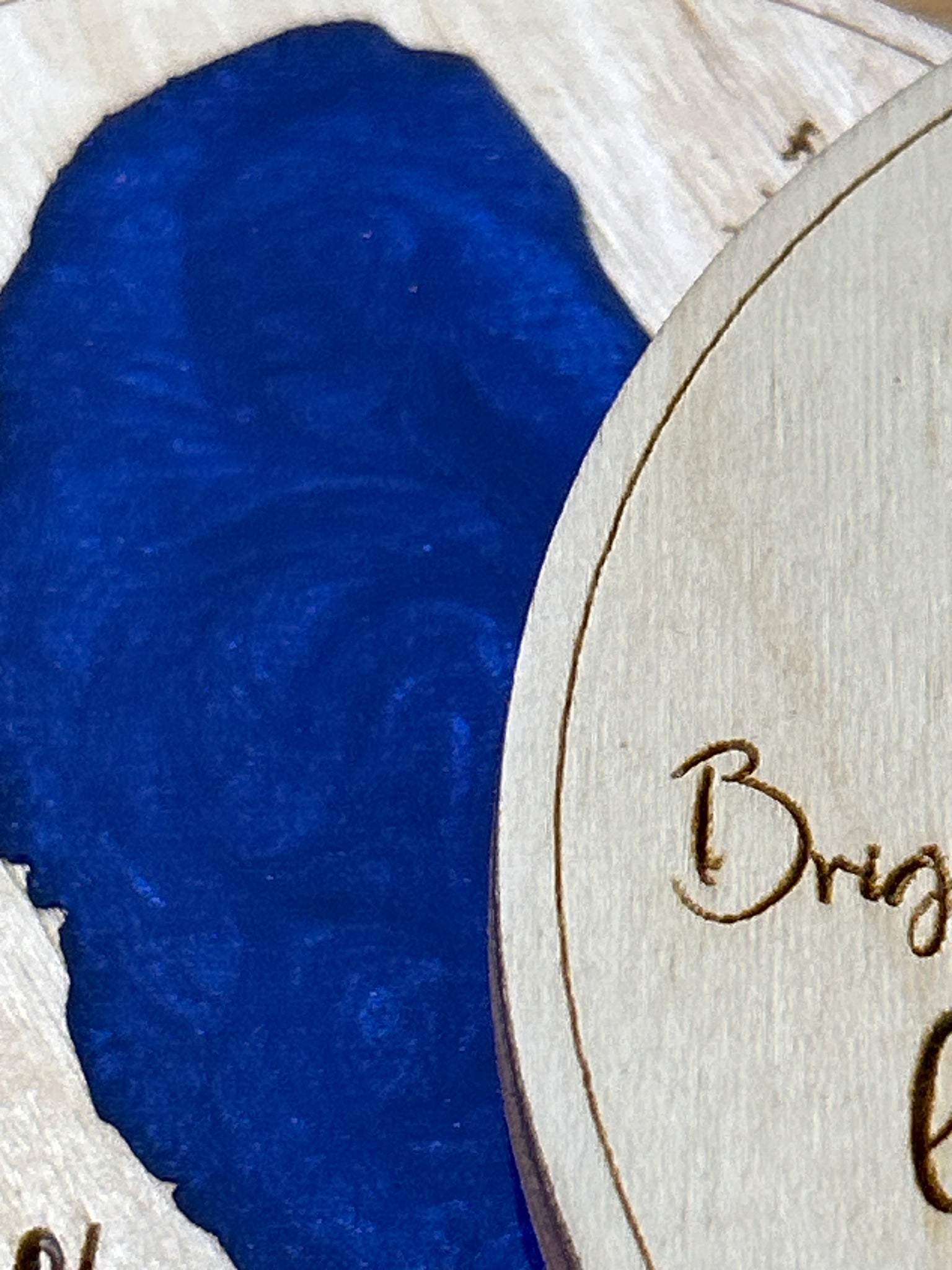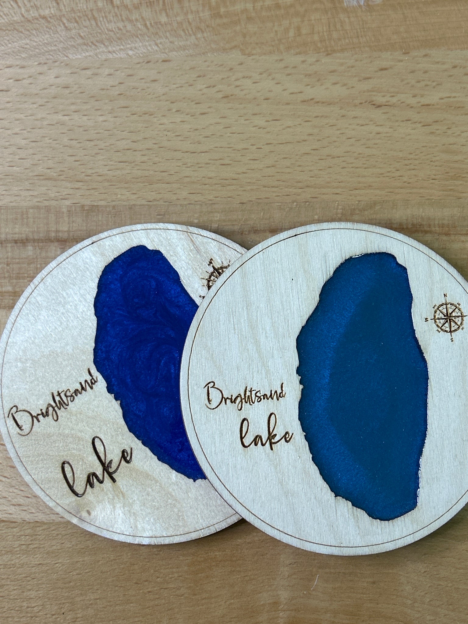 Add a rustic yet elegant touch to your space with this handcrafted Brightsand Lake coaster. 4-inch round coaster features a beautiful combination of natural wood, divided with a striking resin inlay that captures the unique shape of Brightsand Lake in vivid, shimmering blue epoxy. The design is accented with an engraved compass rose and elegant lettering, making it both a functional piece and a conversation starter.