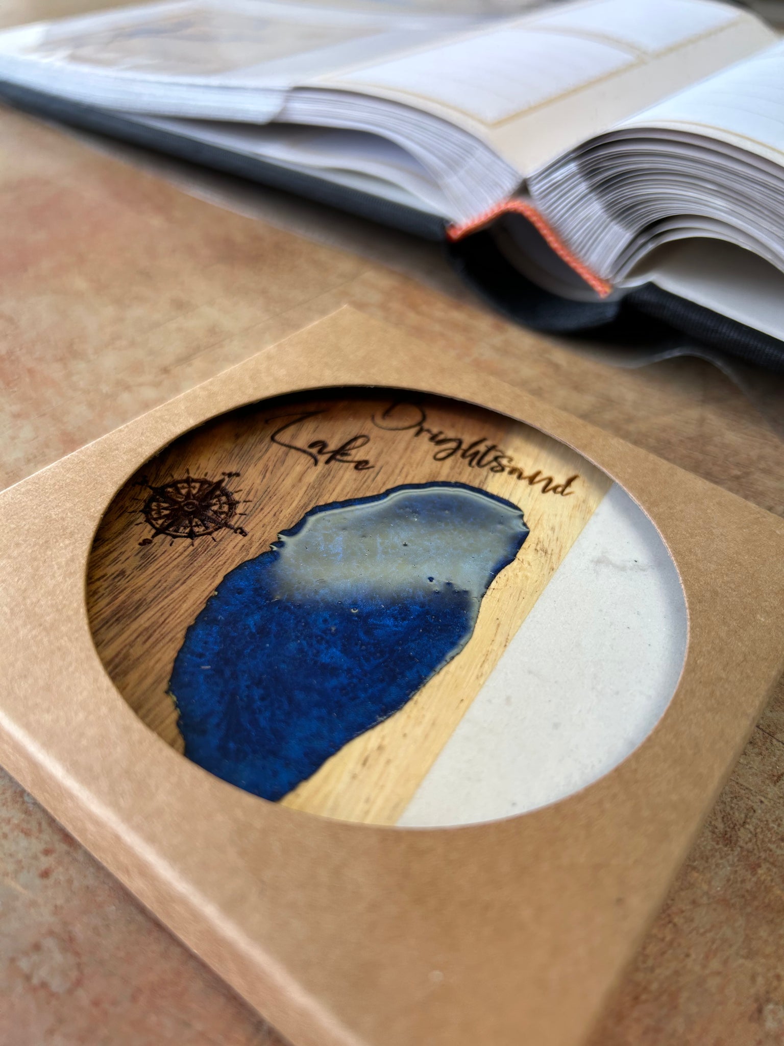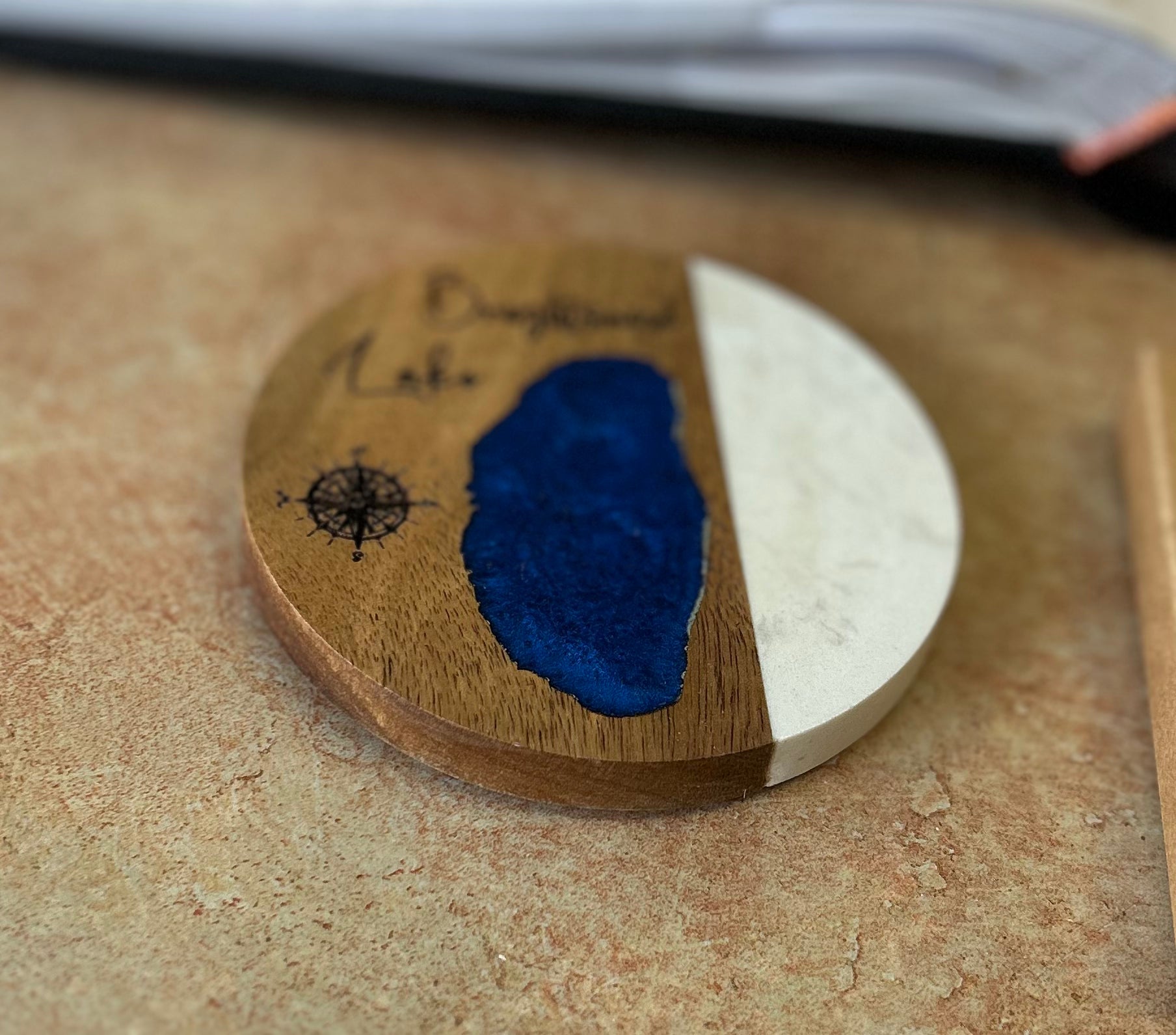 Add a rustic yet elegant touch to your space with this handcrafted Brightsand Lake coaster. 4-inch round coaster features a beautiful combination of natural wood and stone, divided with a striking resin inlay that captures the unique shape of Brightsand Lake in vivid, shimmering blue epoxy. The design is accented with an engraved compass rose and elegant lettering, making it both a functional piece and a conversation starter.