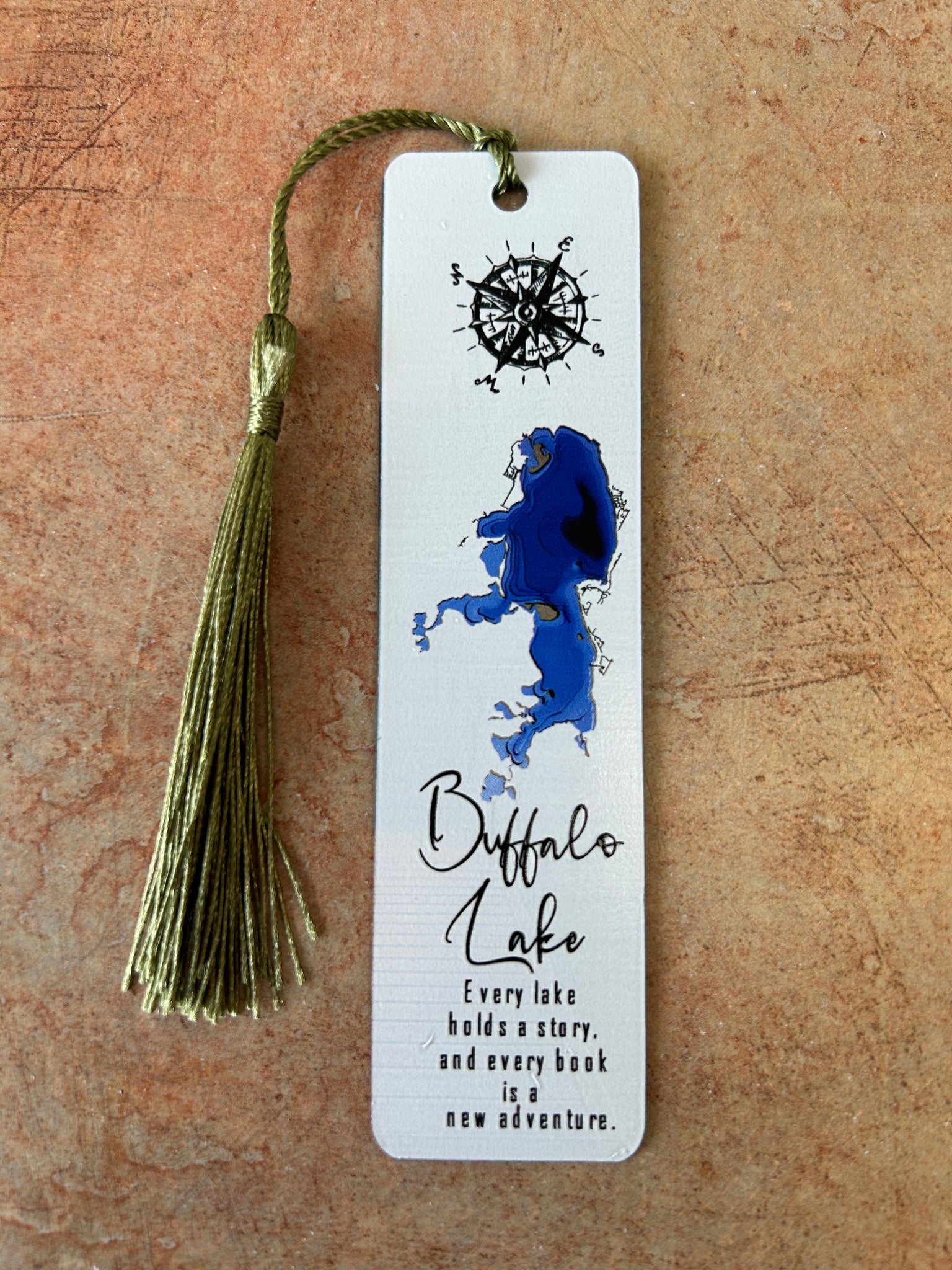• Side 1: A detailed map of Buffalo Lake in bold blue, paired with a compass rose and the inspiring quote, “Every lake holds a story, and every book is a new adventure.”