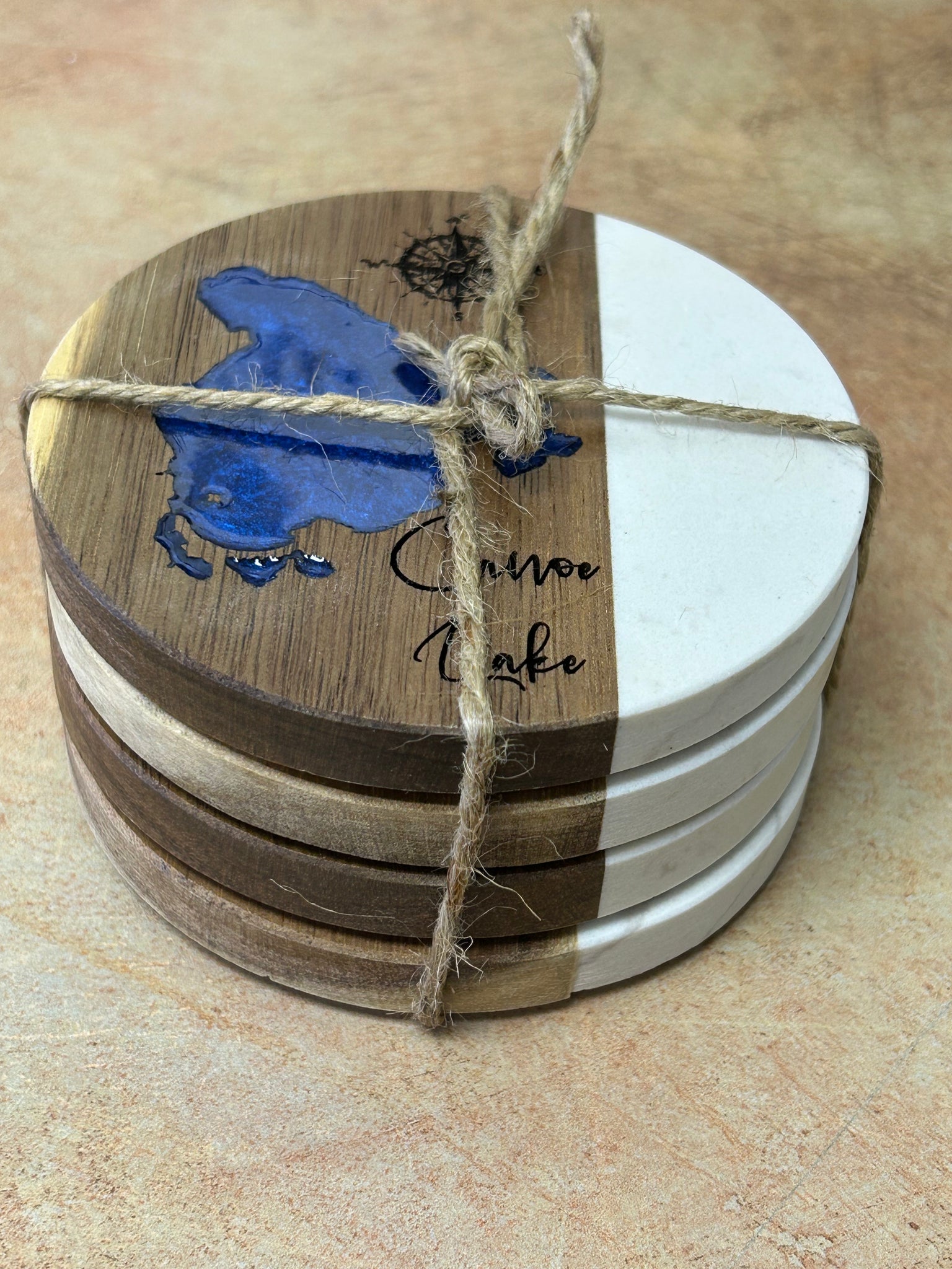Add a rustic yet elegant touch to your space with this handcrafted Canoe Lake coasters. 4-inch round coaster features a beautiful combination of natural wood and stone, divided with a striking resin inlay that captures the unique shape of Canoe Lake in vivid, shimmering blue epoxy. The design is accented with an engraved compass rose and elegant lettering, making it both a functional piece and a conversation starter.