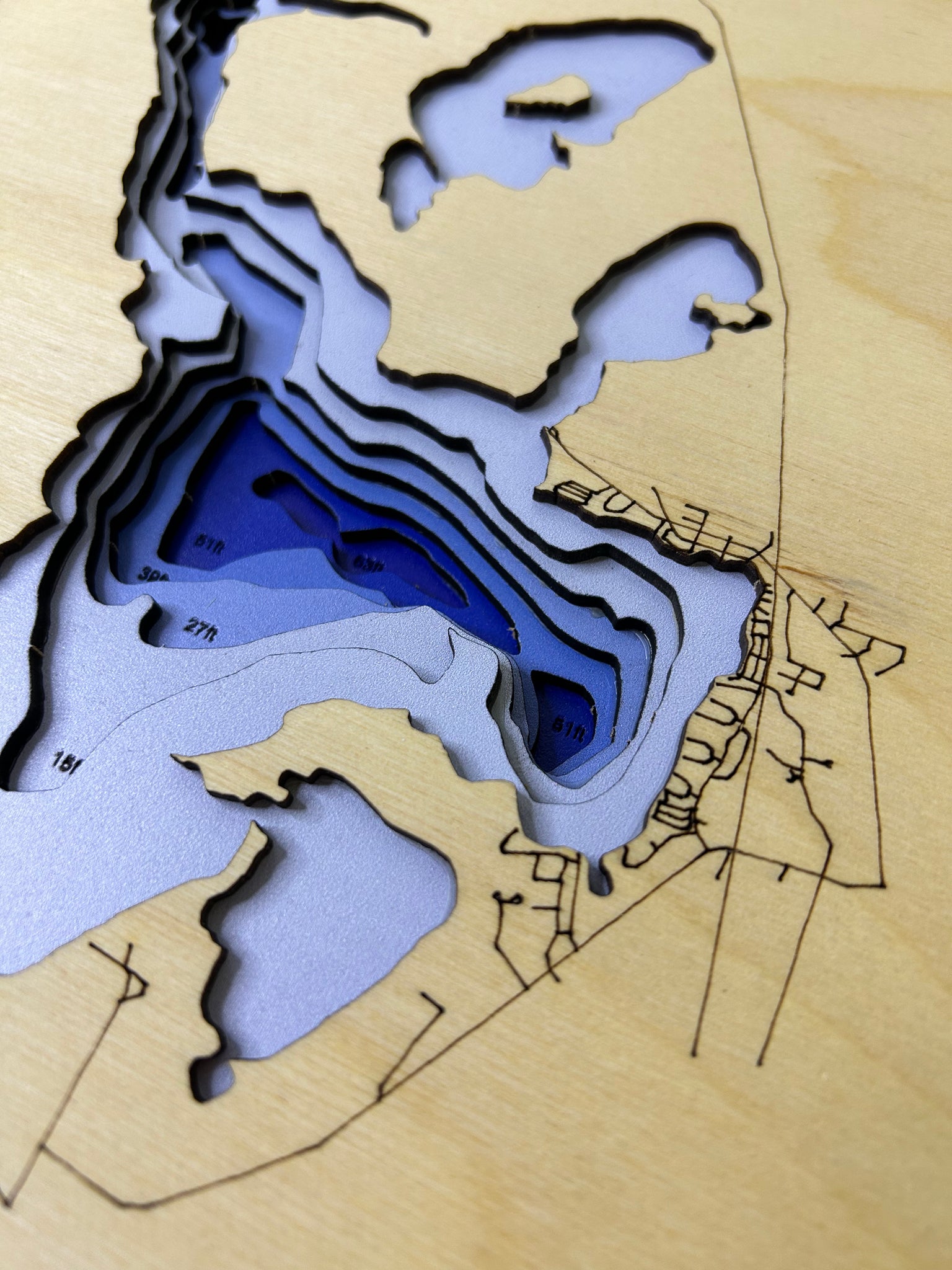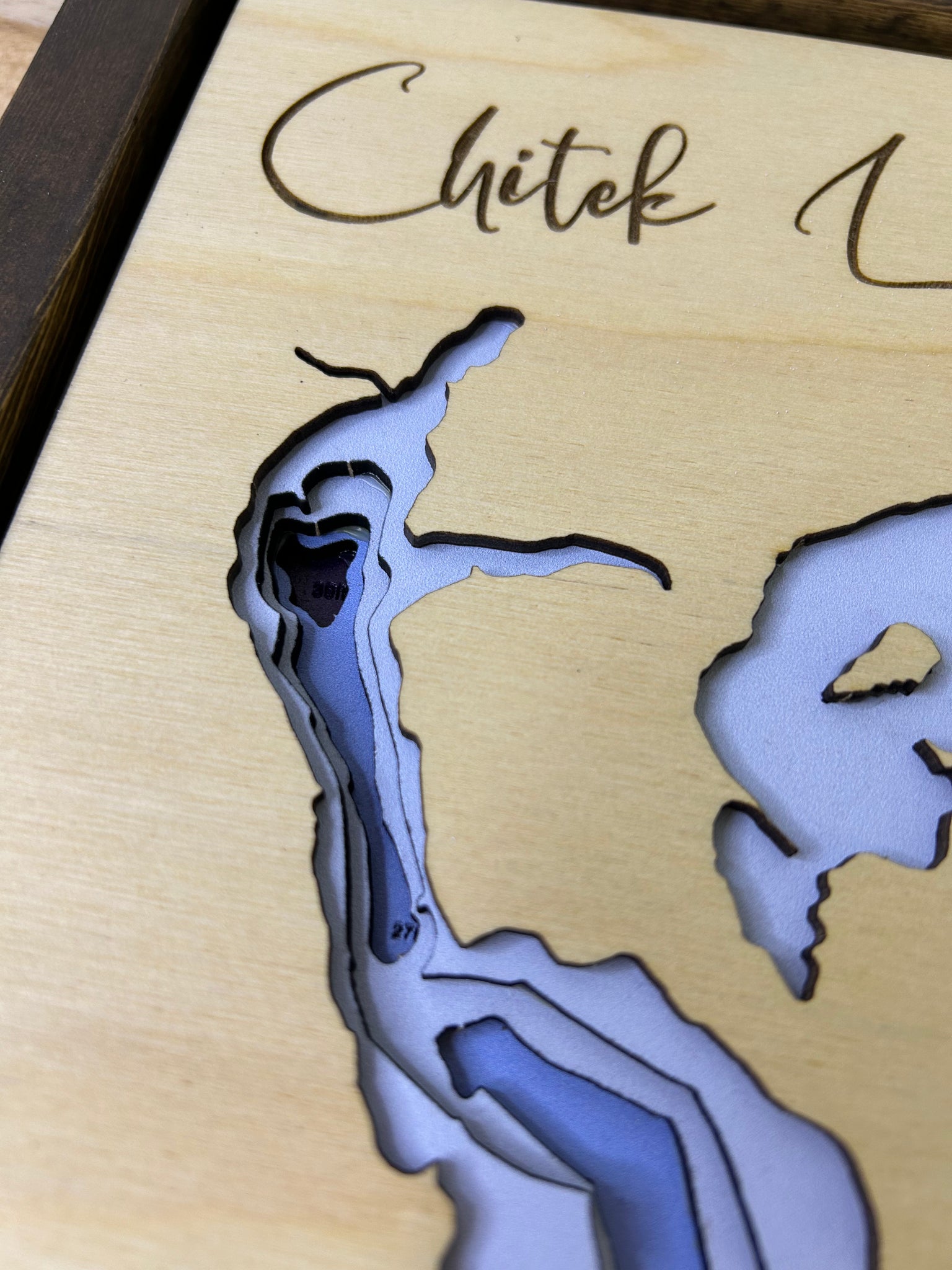 This handcrafted layered map features 8 precisely laser-cut layers in vibrant colours, capturing the depth and beauty of Chitek Lake . Each piece is hand-assembled and set in a high-quality wooden frame with a solid back panel, ready to hang on your wall.