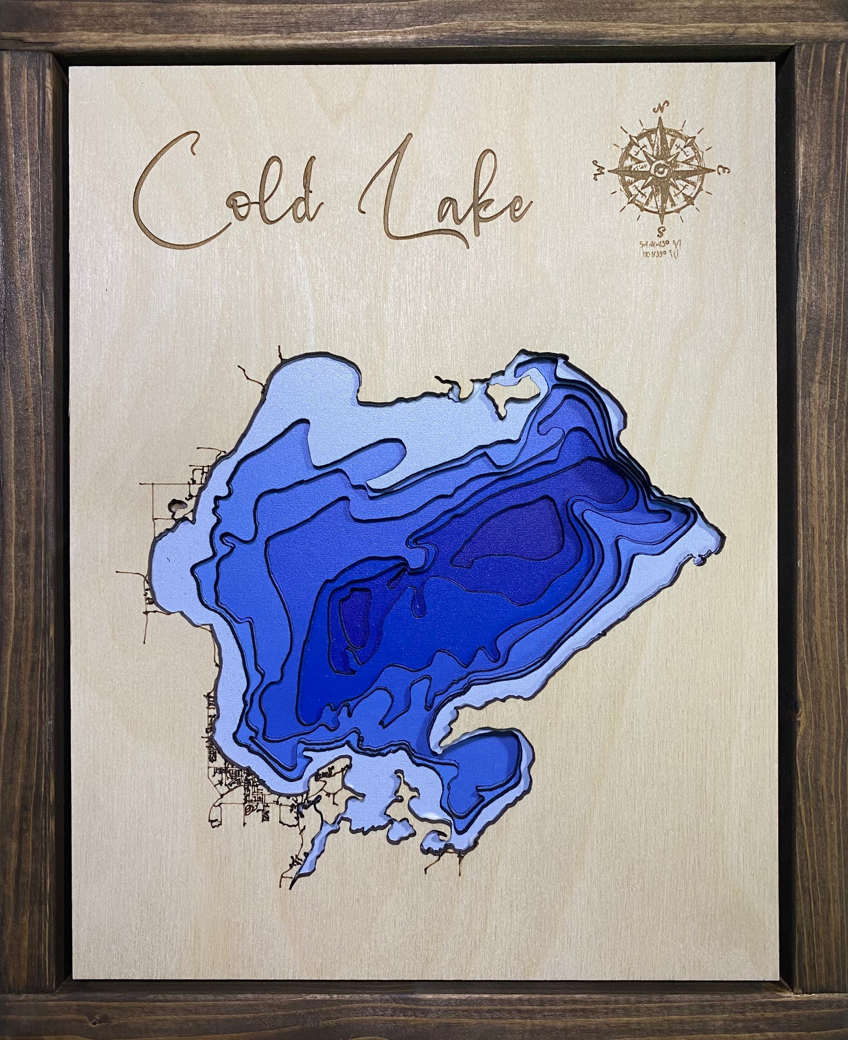 This handcrafted layered map features 8 precisely laser-cut layers in vibrant colours, capturing the depth and beauty of Cold Lake . Each piece is hand-assembled and set in a high-quality wooden frame with a solid back panel, ready to hang on your wall.