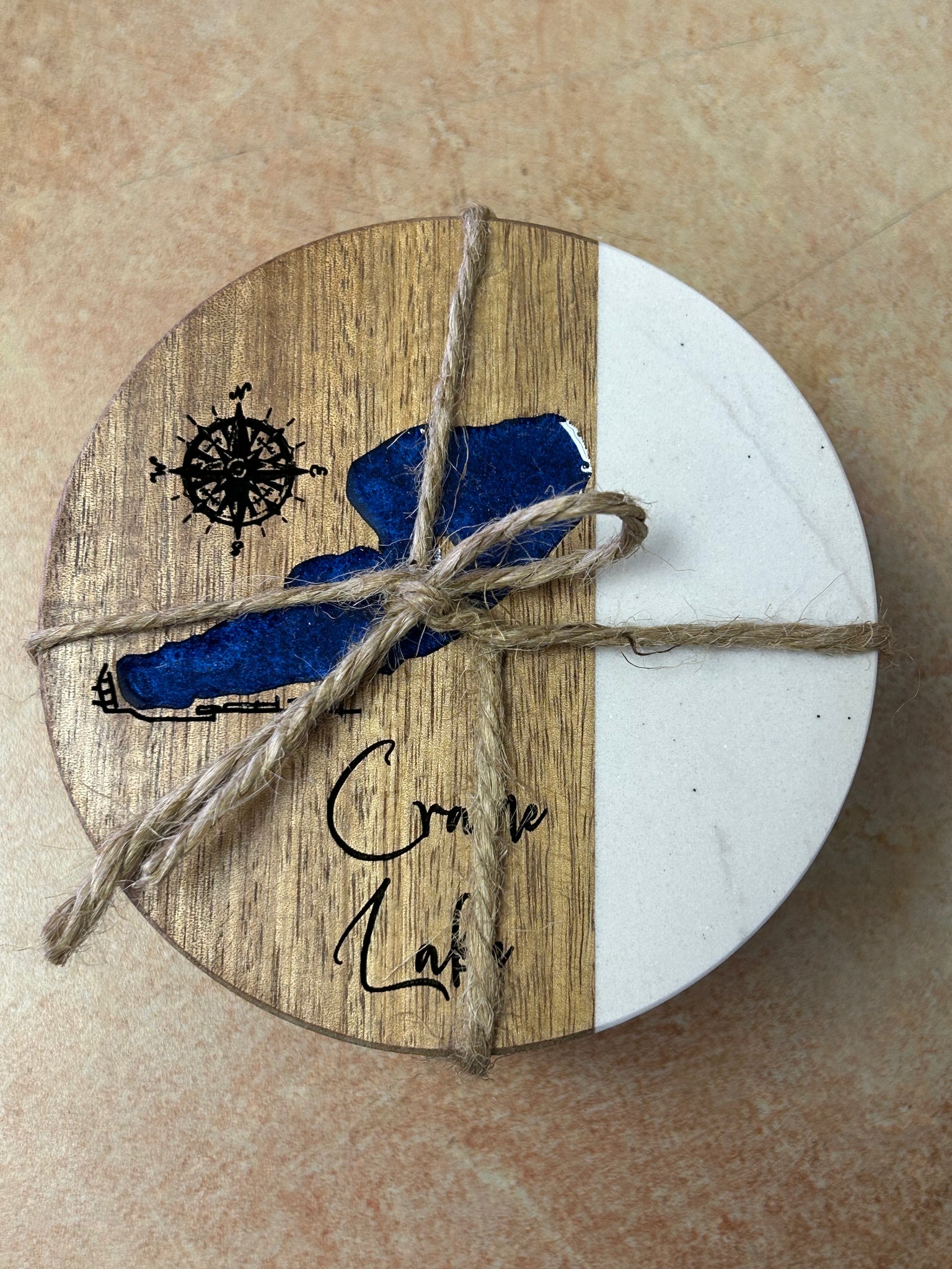 Add a rustic yet elegant touch to your space with this handcrafted Crane Lake coasters. 4-inch round coaster features a beautiful combination of natural wood and stone, divided with a striking resin inlay that captures the unique shape of Crane Lake in vivid, shimmering blue epoxy. The design is accented with an engraved compass rose and elegant lettering, making it both a functional piece and a conversation starter.