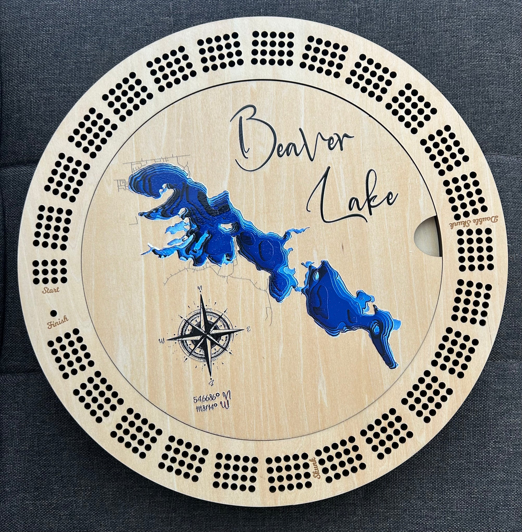 This 11-inch round cribbage board features a beautifully printed bathymetric design of Beaver Lake, combining classic gameplay with meaningful lake-inspired art.