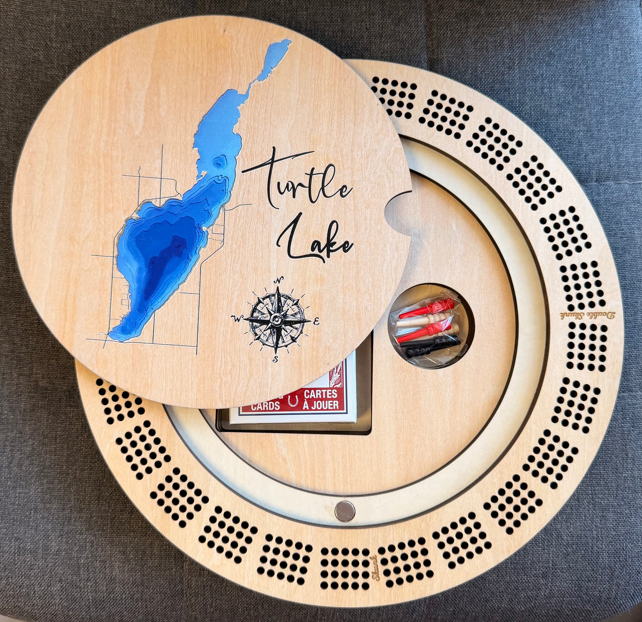 This 11-inch round cribbage board features a beautifully printed bathymetric design of Your Lake, combining classic gameplay with meaningful lake design .