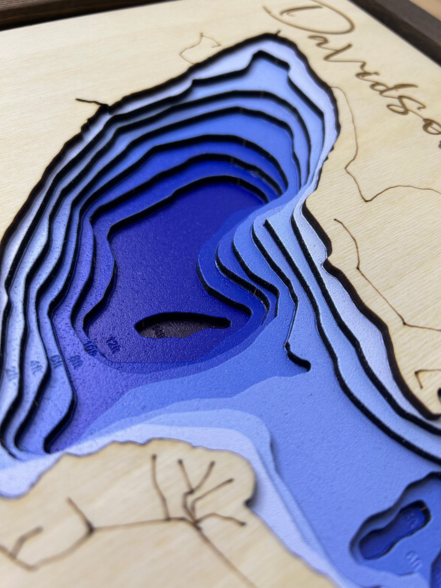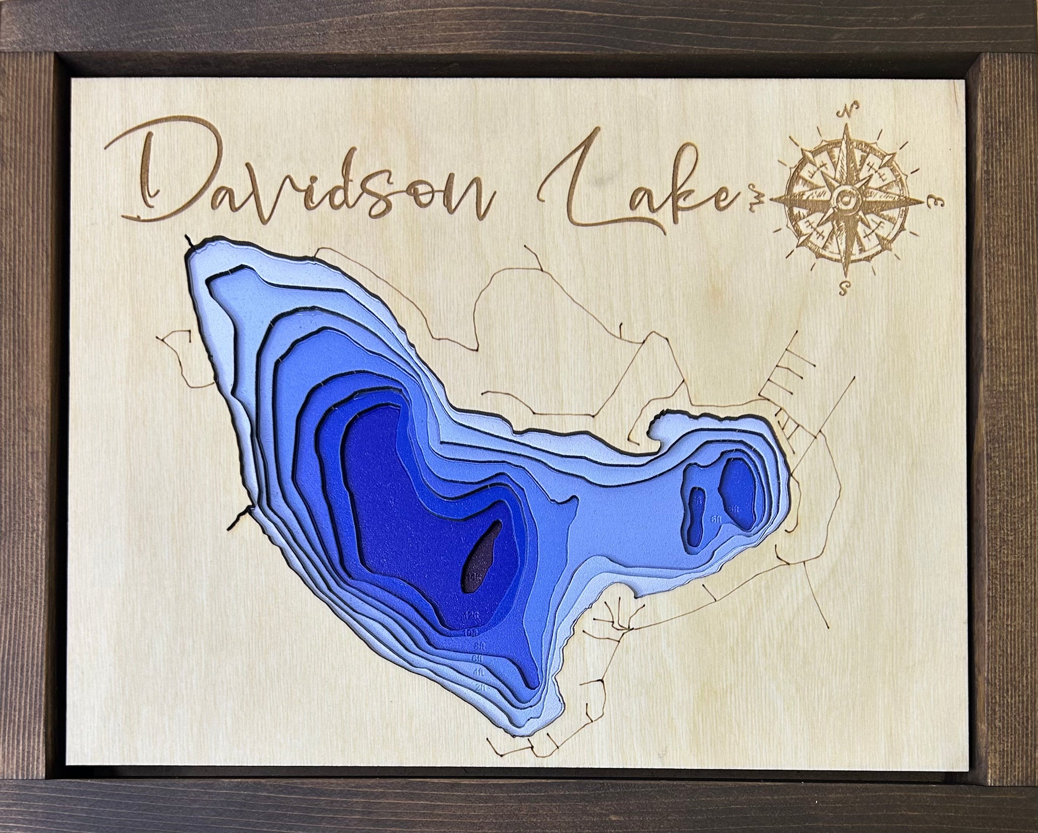 This handcrafted layered map features 8 precisely laser-cut layers in vibrant colours, capturing the depth and beauty of Davidson Lake . Each piece is hand-assembled and set in a high-quality wooden frame with a solid back panel, ready to hang on your wall.