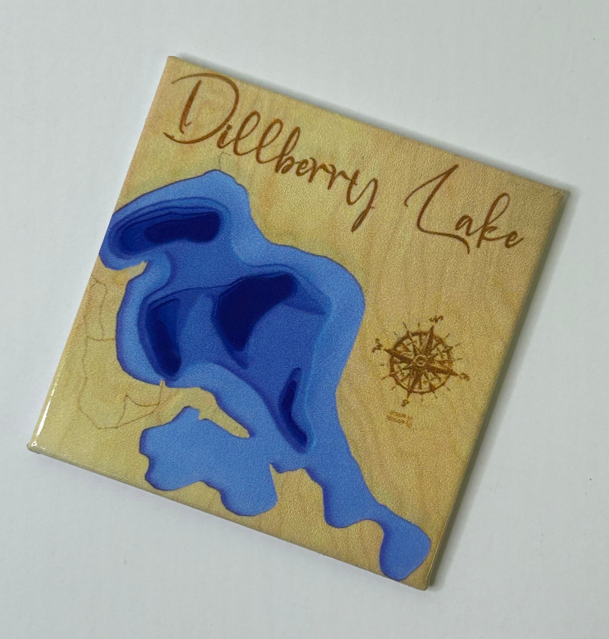 Bring the beauty of Dillberry Lake, to your space with this stunning 2x4-inch magnet. Featuring an accurate bathymetric depth map, this design showcases a layered blue engraving that highlights the lake’s underwater contours.