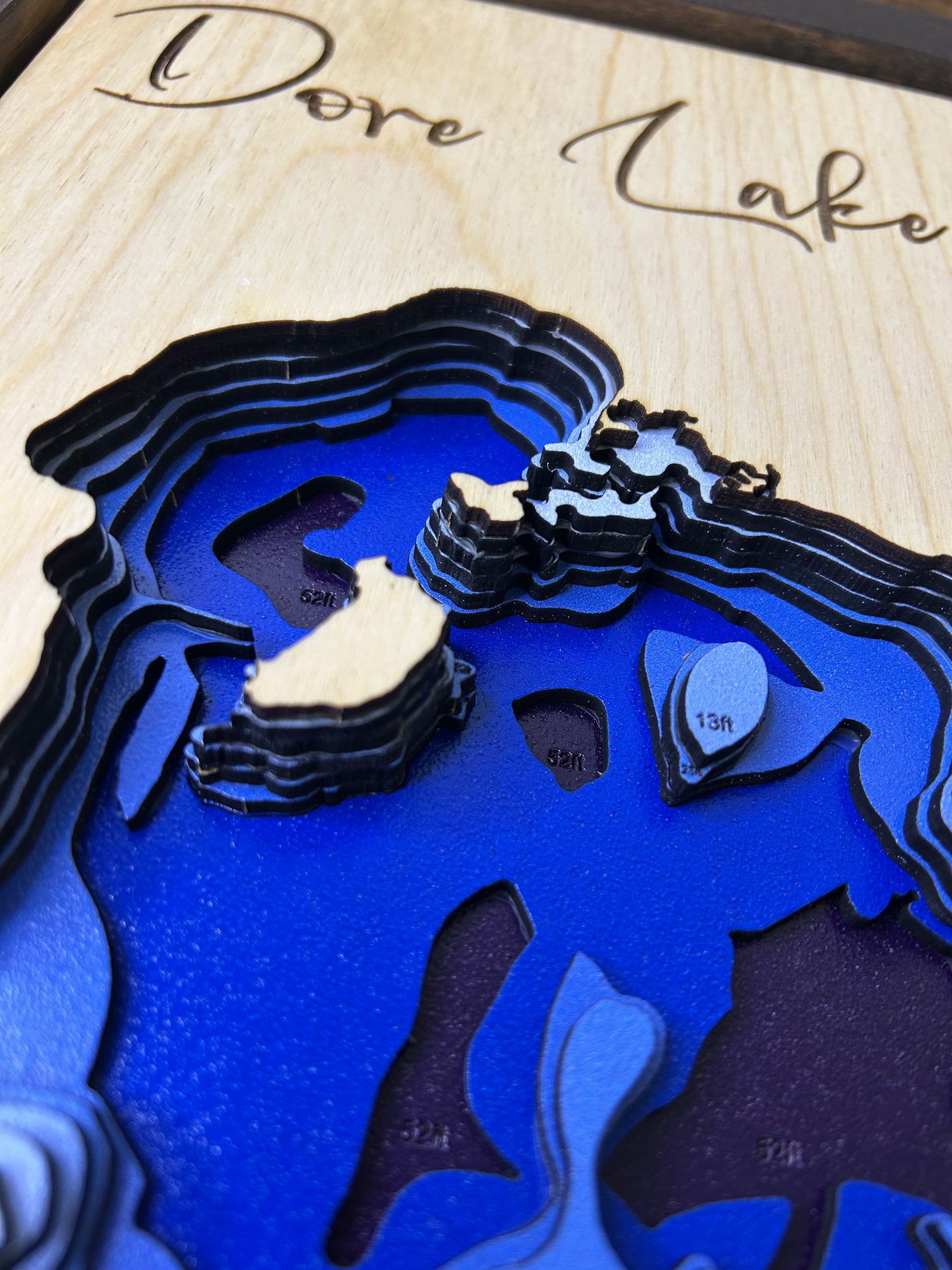 This handcrafted layered map features 8 precisely laser-cut layers in vibrant colours, capturing the depth and beauty of Dore Lake. Each piece is hand-assembled and set in a high-quality wooden frame with a solid back panel, ready to hang on your wall.