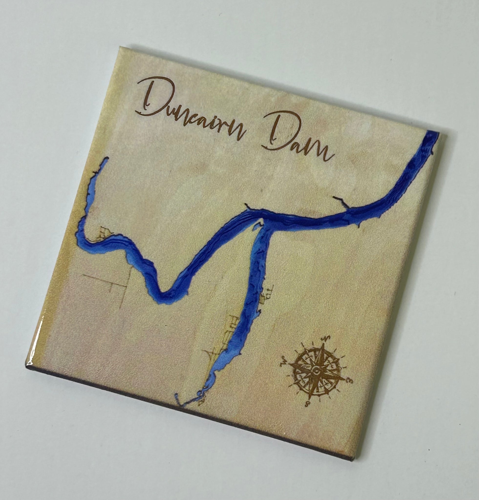 Bring the beauty of Duncairn Dam , to your space with this stunning 2x4-inch magnet. Featuring an accurate bathymetric depth map, this design showcases a layered blue engraving that highlights the lake’s underwater contours.
