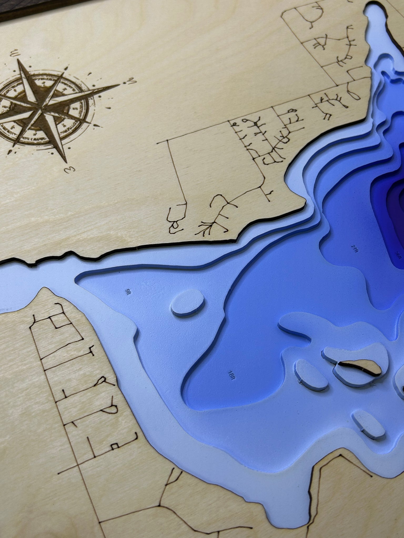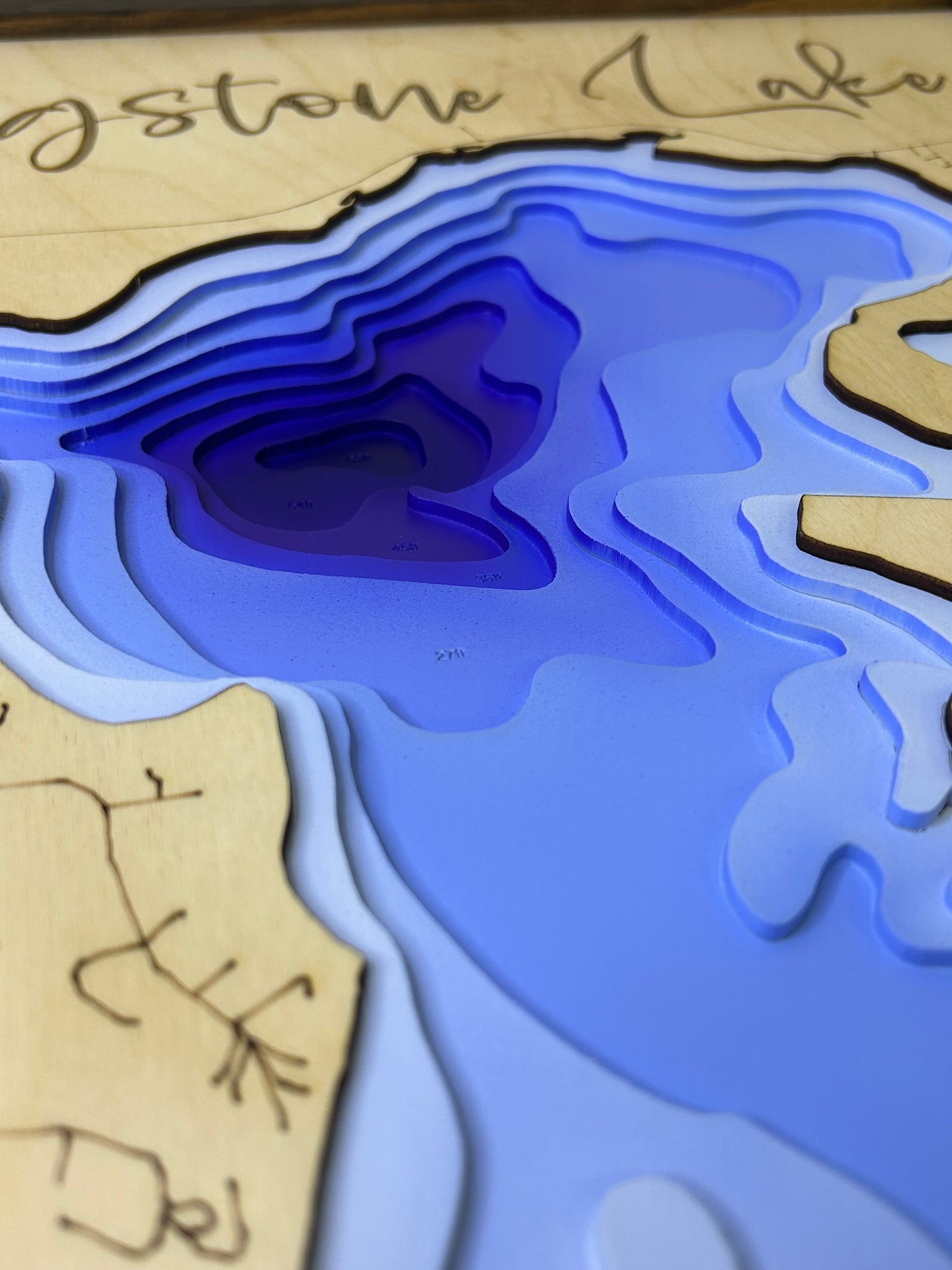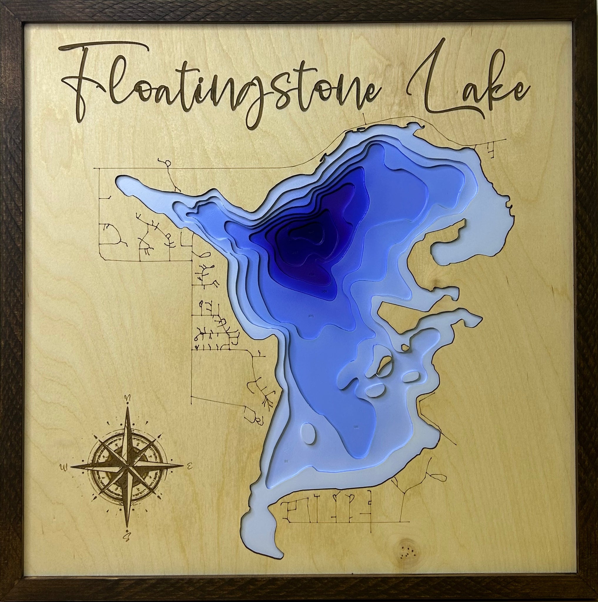 Dark brown frame , 20x20” .7 layers . Layered art . Cnc cutouts glued to lake surface, painted by airbrush with wooden frame and back panel for hanging to the wall. Made in Canada , Lloydminster,Sk