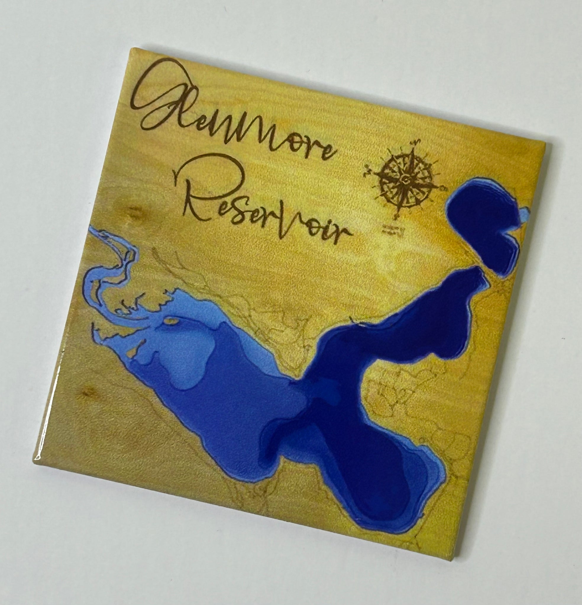 Bring the beauty of Glenmore Reservoir , to your space with this stunning 2x4-inch magnet. Featuring an accurate bathymetric depth map, this design showcases a layered blue engraving that highlights the lake’s underwater contours.