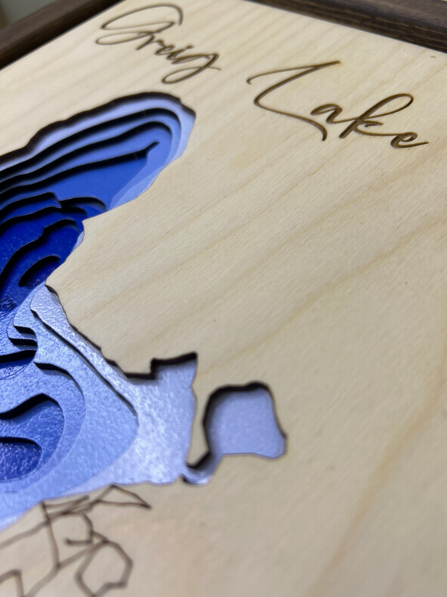 This handcrafted layered map features 8 precisely laser-cut layers in vibrant colours, capturing the depth and beauty of Greig Lake. Each piece is hand-assembled and set in a high-quality wooden frame with a solid back panel, ready to hang on your wall.