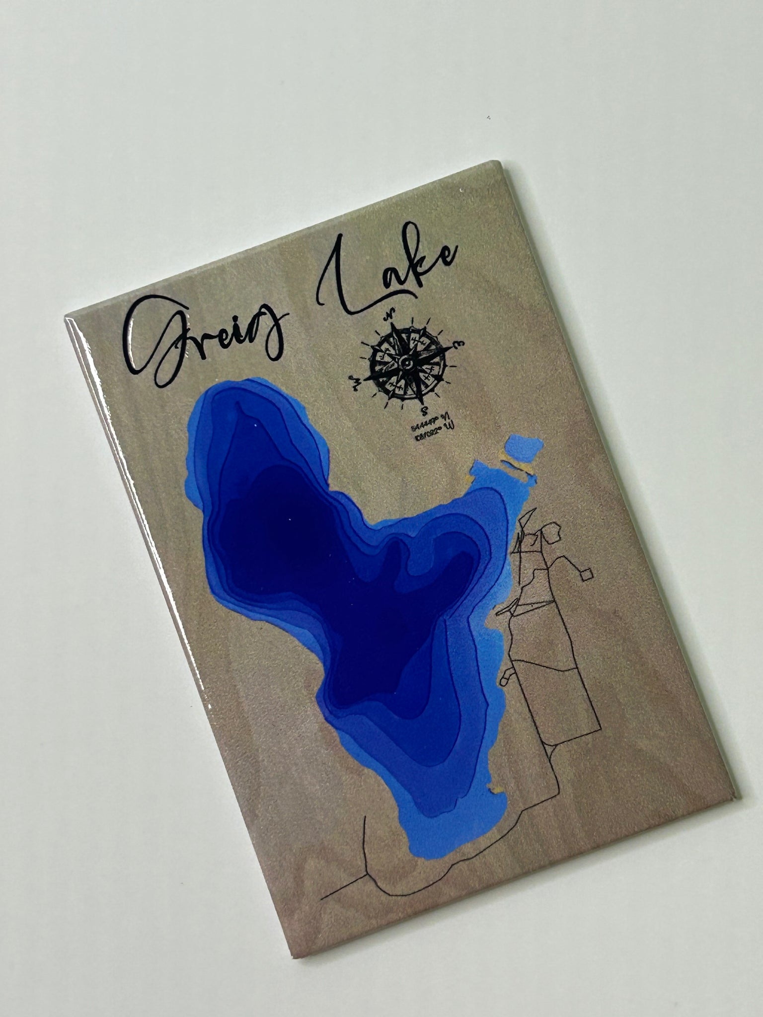 Crafted with precision using UV printing, this magnet captures the lake’s natural shape, surrounding road layout, and a decorative compass for a unique touch. The shimmering background adds a rustic yet modern appeal.
