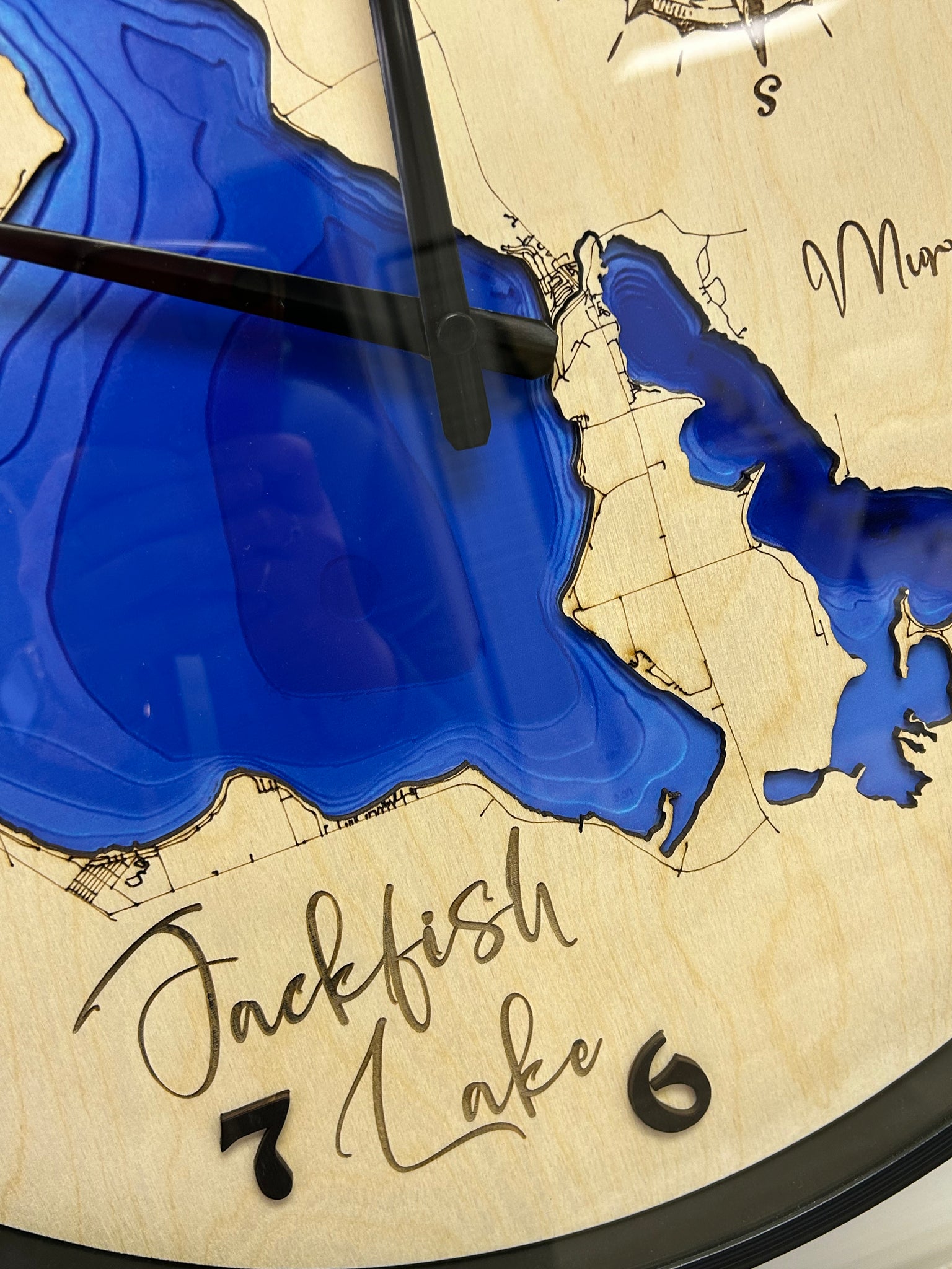 This 20in wall clock beautifully showcases a laser-cut map of your favorite lake, elegantly set against a wooden background with a sturdy plastic frame. The lake design is precise and detailed, creating a unique piece perfect for any home, cabin, or lake house. Complete with easy-to-read numbers and a decorative compass rose, this clock adds a touch of rustic charm to your decor while celebrating your connection to nature.