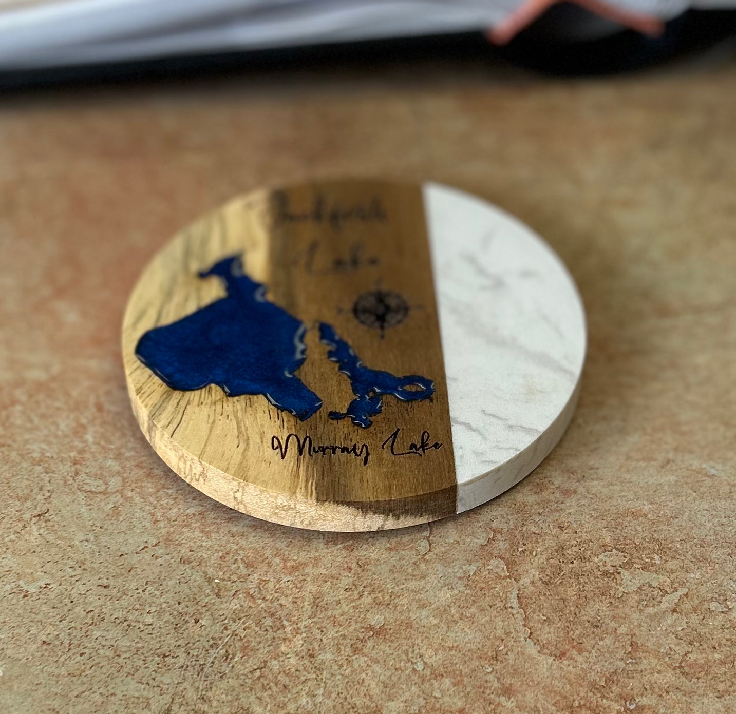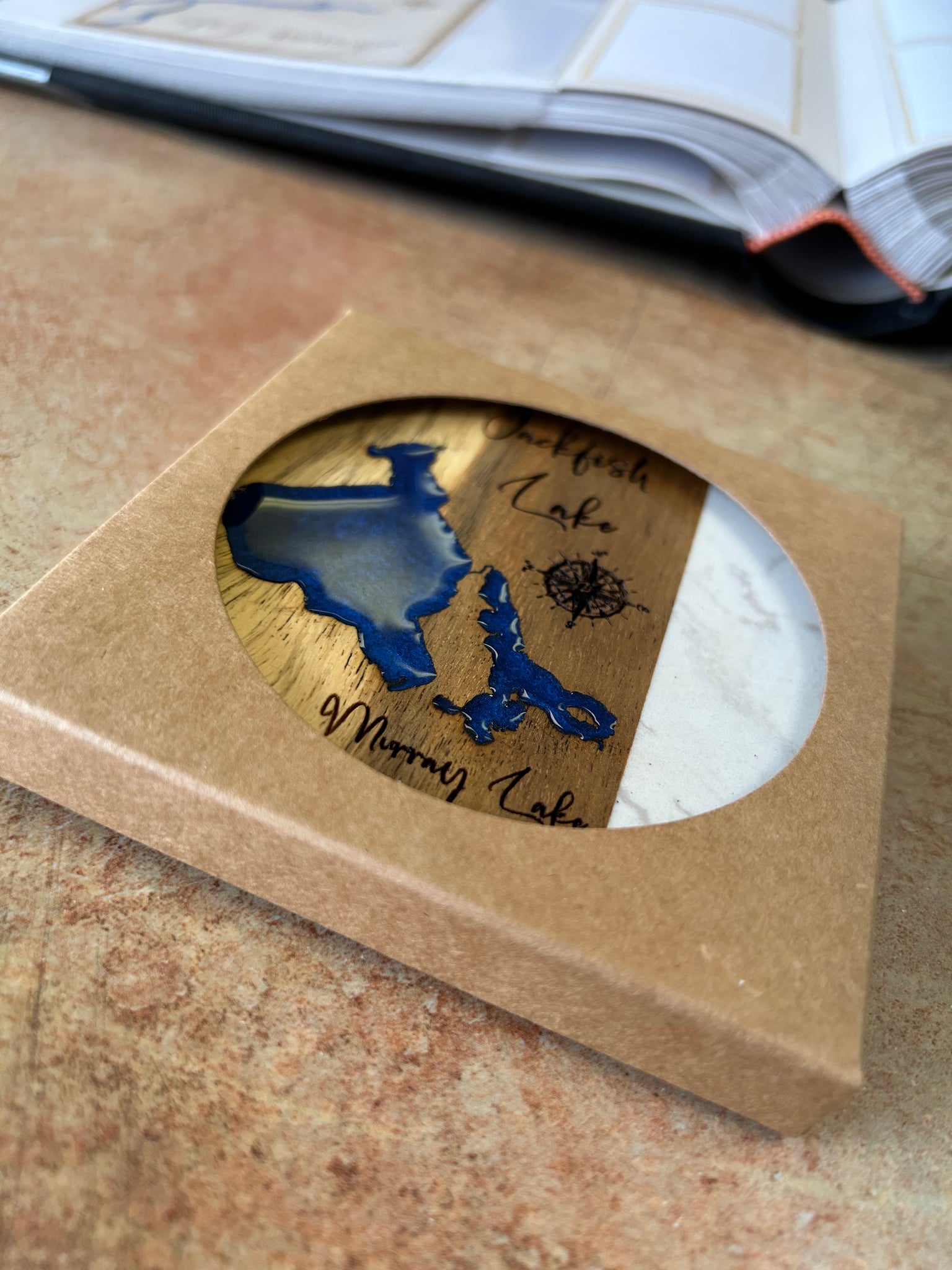 Add a rustic yet elegant touch to your space with this handcrafted Jackfish Lake coaster. 4-inch round coaster features a beautiful combination of natural wood and stone, divided with a striking resin inlay that captures the unique shape of Jackfish Lake in vivid, shimmering blue epoxy. The design is accented with an engraved compass rose and elegant lettering, making it both a functional piece and a conversation starter.