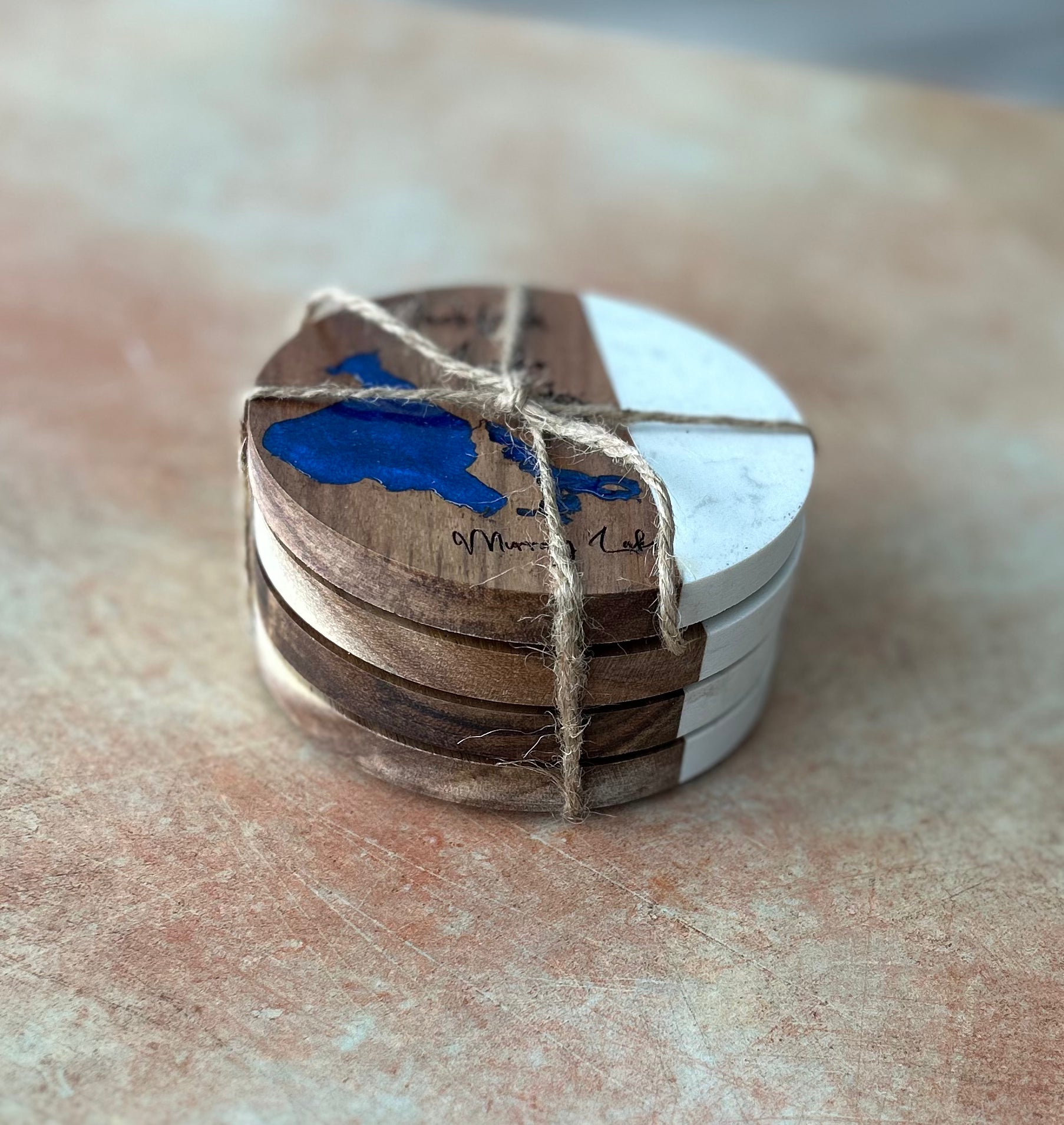 Jackfish Lake, SK set of 4 Coasters – Wood, Stone & Epoxy Resin (4” Diameter)