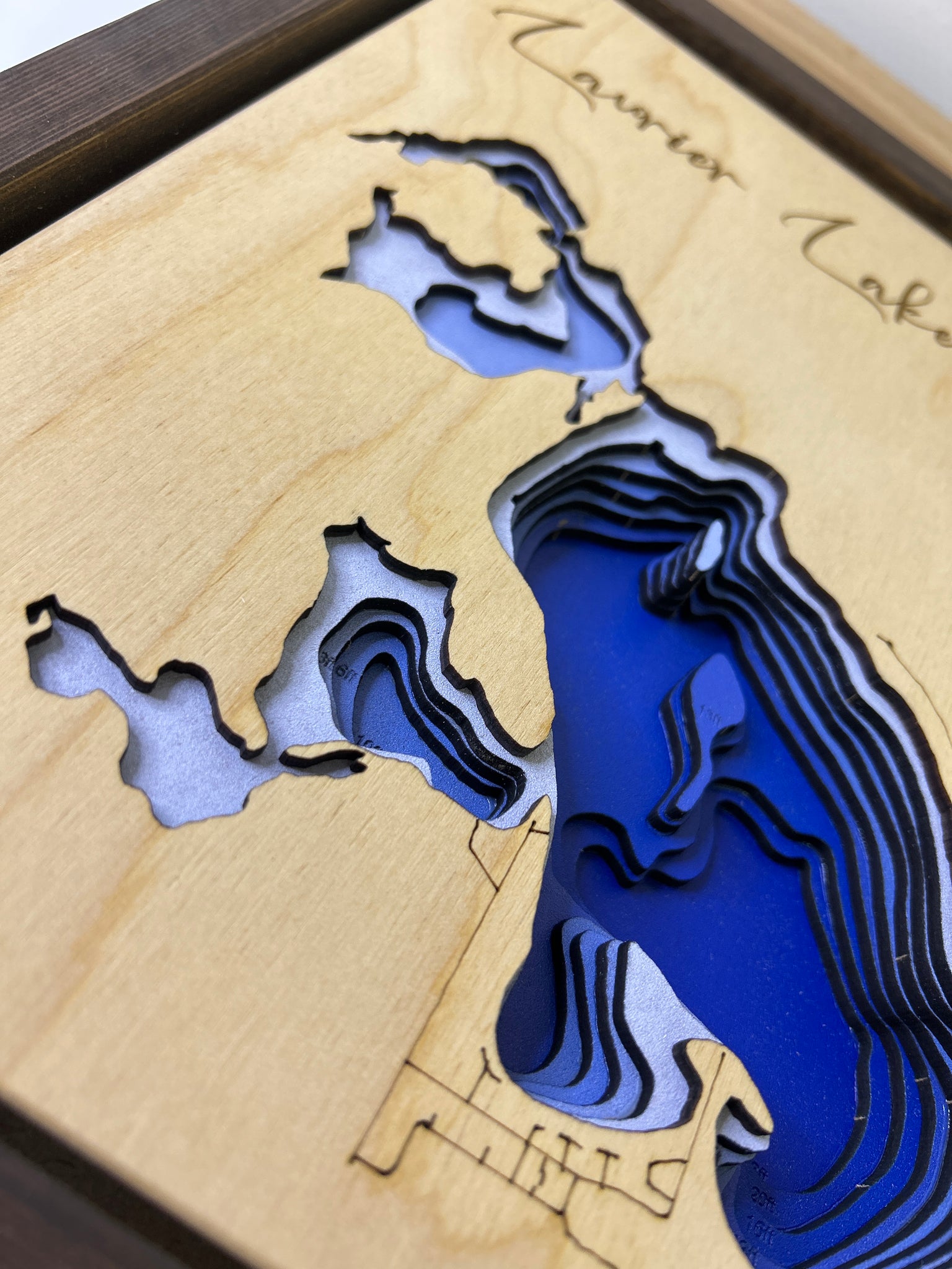 This handcrafted layered map features 8 precisely laser-cut layers in vibrant colours, capturing the depth and beauty of Laurier Lake . Each piece is hand-assembled and set in a high-quality wooden frame with a solid back panel, ready to hang on your wall.