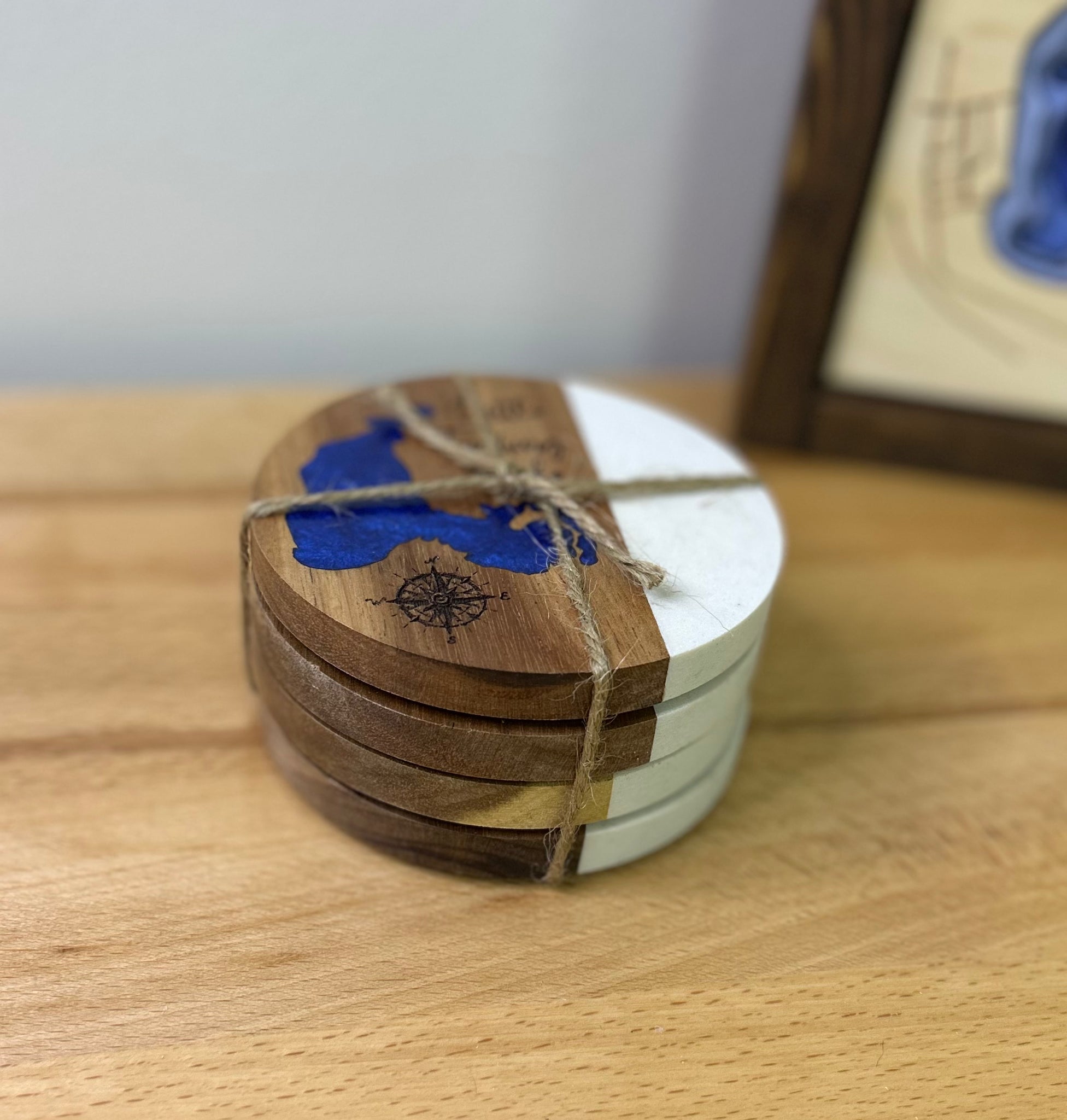 Add a rustic yet elegant touch to your space with this handcrafted Little Fishing Lake coasters. 4-inch round coaster features a beautiful combination of natural wood and stone, divided with a striking resin inlay that captures the unique shape of Little Fishing Lake in vivid, shimmering blue epoxy. The design is accented with an engraved compass rose and elegant lettering, making it both a functional piece and a conversation starter.