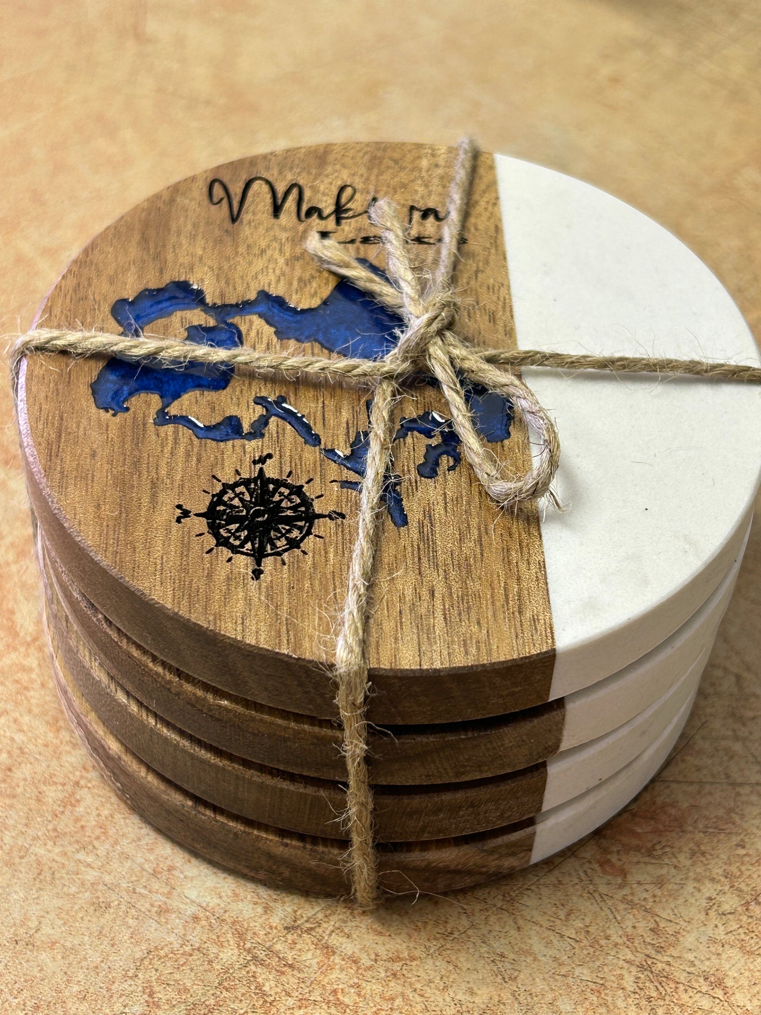 Add a rustic yet elegant touch to your space with this handcrafted Makwa Lake coasters. 4-inch round coaster features a beautiful combination of natural wood and stone, divided with a striking resin inlay that captures the unique shape of Makwa Lake in vivid, shimmering blue epoxy. The design is accented with an engraved compass rose and elegant lettering, making it both a functional piece and a conversation starter.