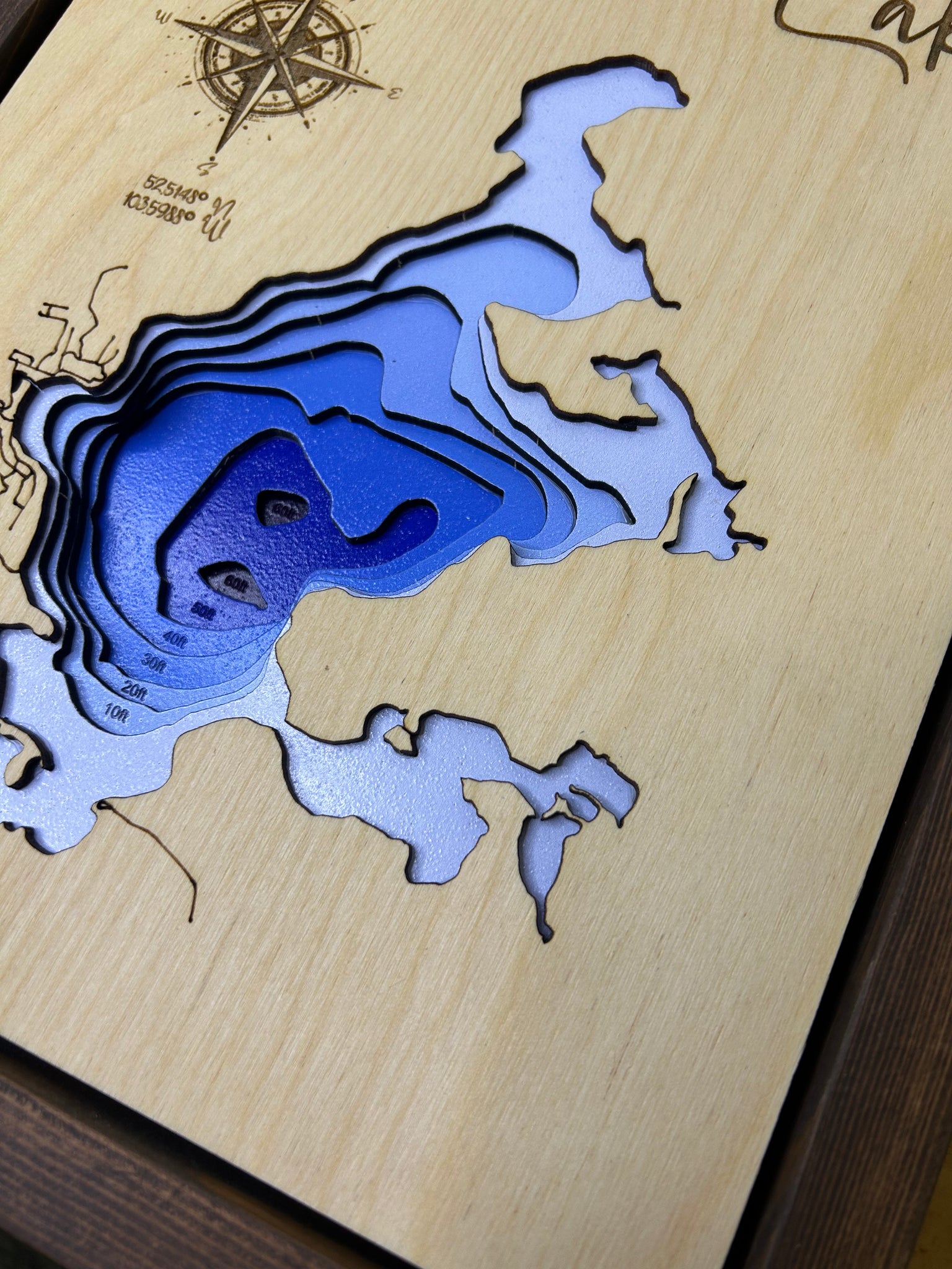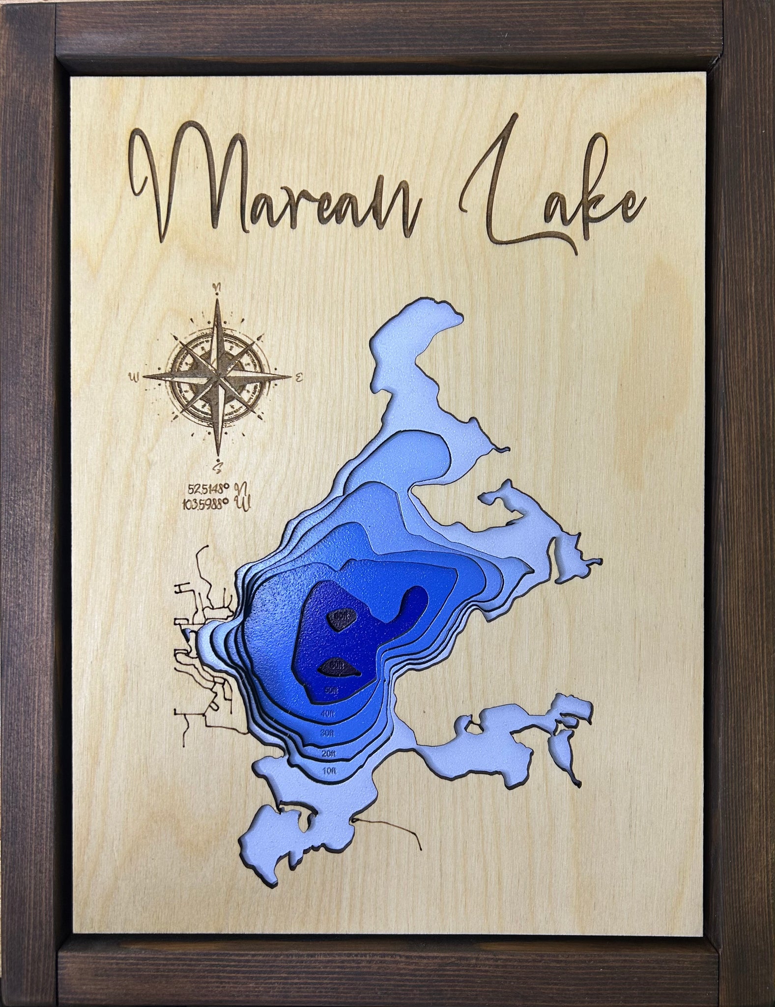This handcrafted layered map features 8 precisely laser-cut layers in vibrant colours, capturing the depth and beauty of Marean Lake . Each piece is hand-assembled and set in a high-quality wooden frame with a solid back panel, ready to hang on your wall.