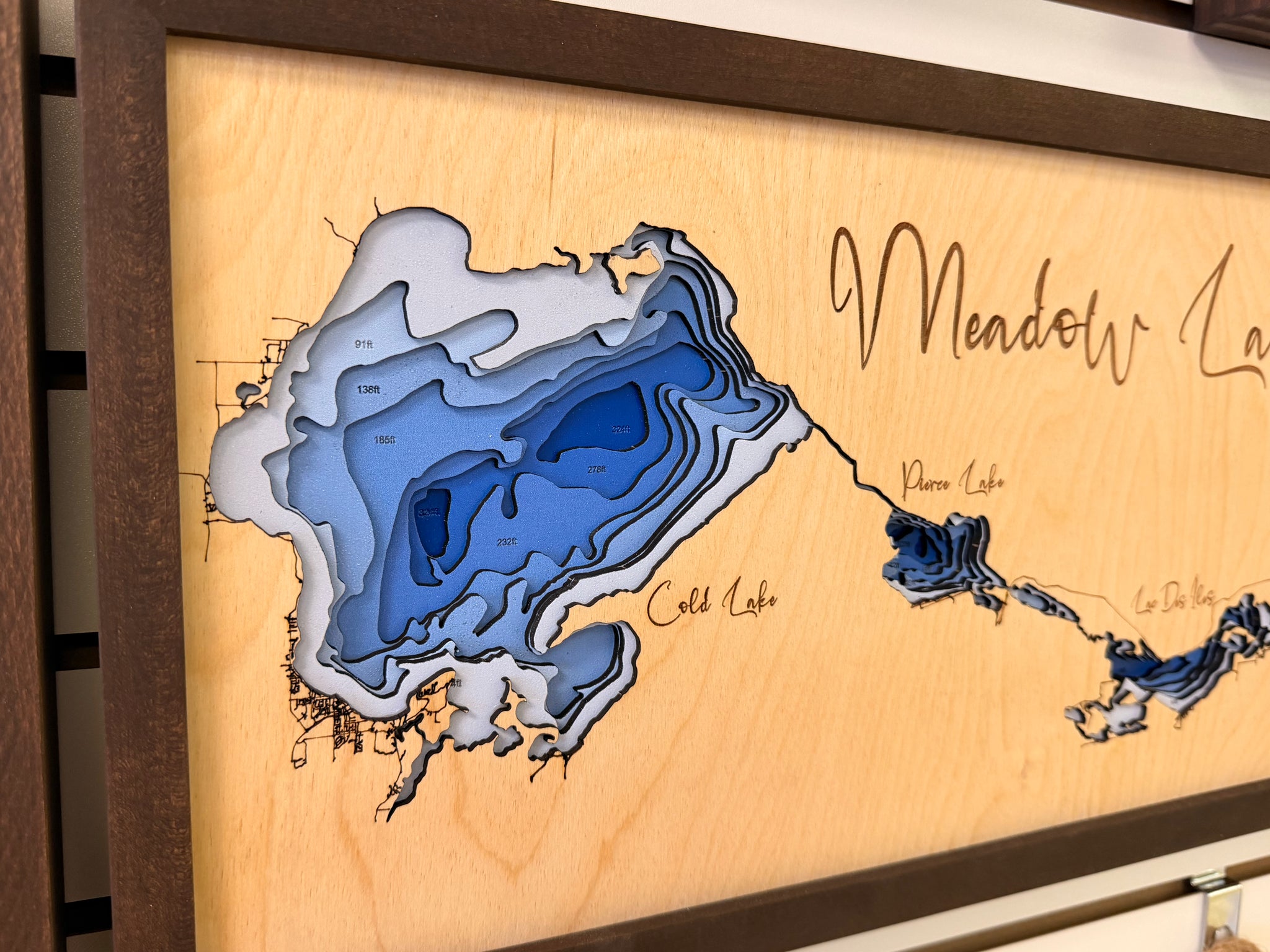• Design Details: Accurate lake shapes with engraved names, vibrant blue water accents, and a decorative compass rose