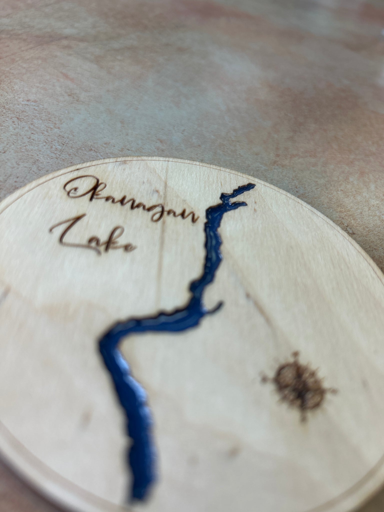Add a rustic yet elegant touch to your space with this handcrafted Okanagan Lake coaster. 4-inch round coaster features a beautiful combination of natural wood, divided with a striking resin inlay that captures the unique shape of Okanagan Lake in vivid, shimmering blue epoxy. The design is accented with an engraved compass rose and elegant lettering, making it both a functional piece and a conversation starter.