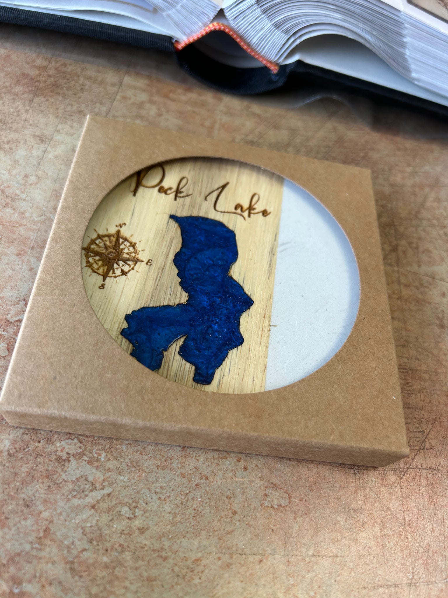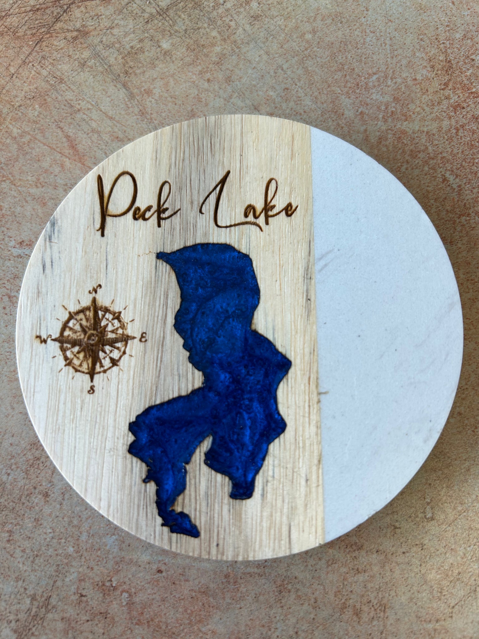 Add a rustic yet elegant touch to your space with this handcrafted Peck Lake coaster. 4-inch round coaster features a beautiful combination of natural wood and stone, divided with a striking resin inlay that captures the unique shape of Peck Lake in vivid, shimmering blue epoxy. The design is accented with an engraved compass rose and elegant lettering, making it both a functional piece and a conversation starter.