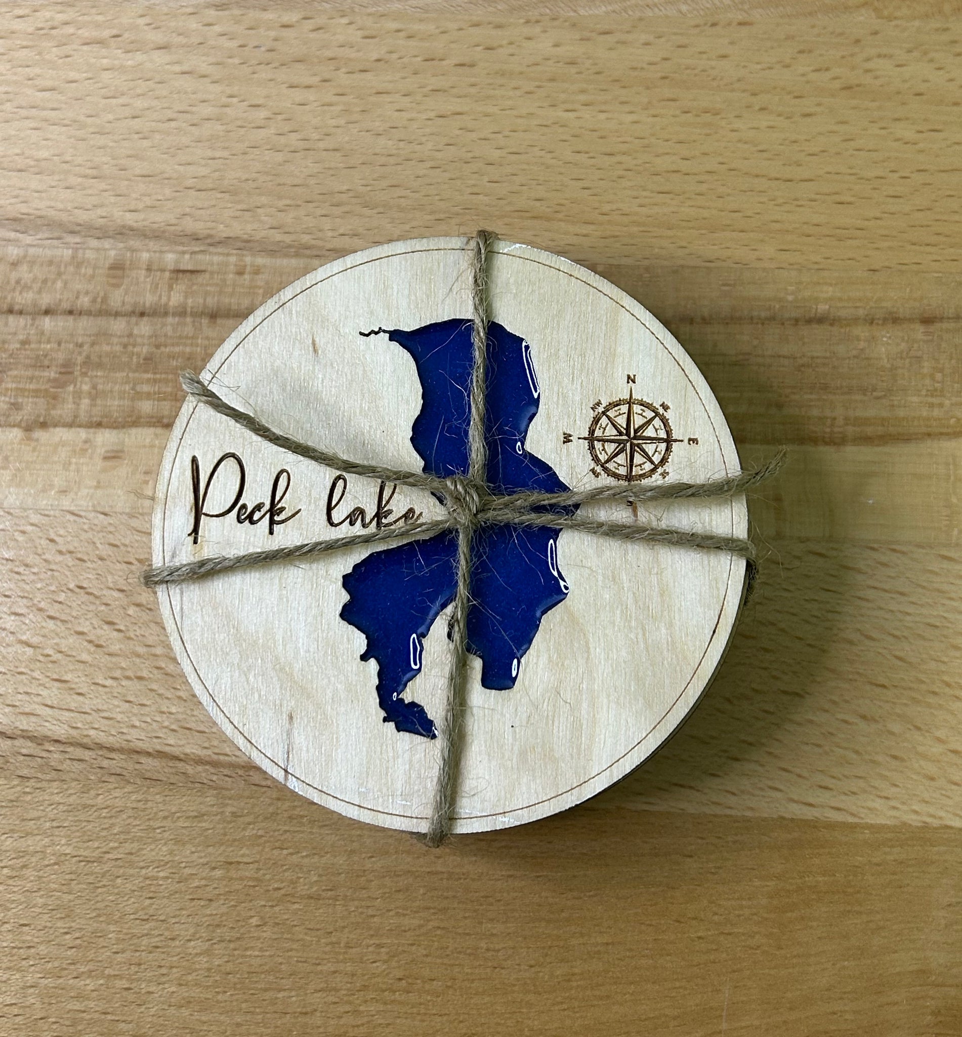 Add a rustic yet elegant touch to your space with this handcrafted Peck Lake coasters. 4-inch round coaster features a beautiful combination of natural wood, divided with a striking resin inlay that captures the unique shape of Peck Lake in vivid, shimmering blue epoxy . The design is accented with an engraved compass rose and elegant lettering, making it both a functional piece and a conversation starter.