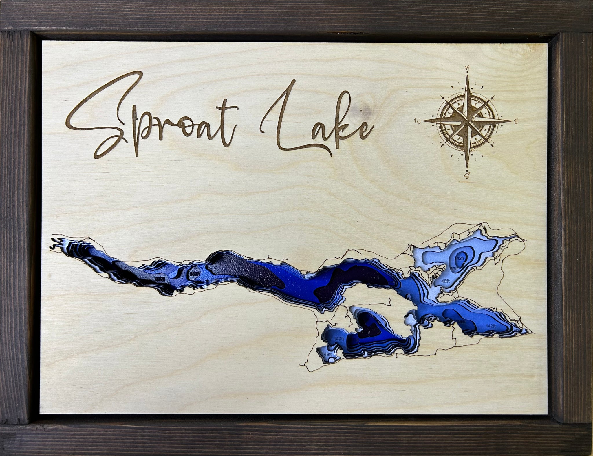 This handcrafted layered map features 8 precisely laser-cut layers in vibrant colours, capturing the depth and beauty of Sproat Lake. Each piece is hand-assembled and set in a high-quality wooden frame with a solid back panel, ready to hang on your wall.