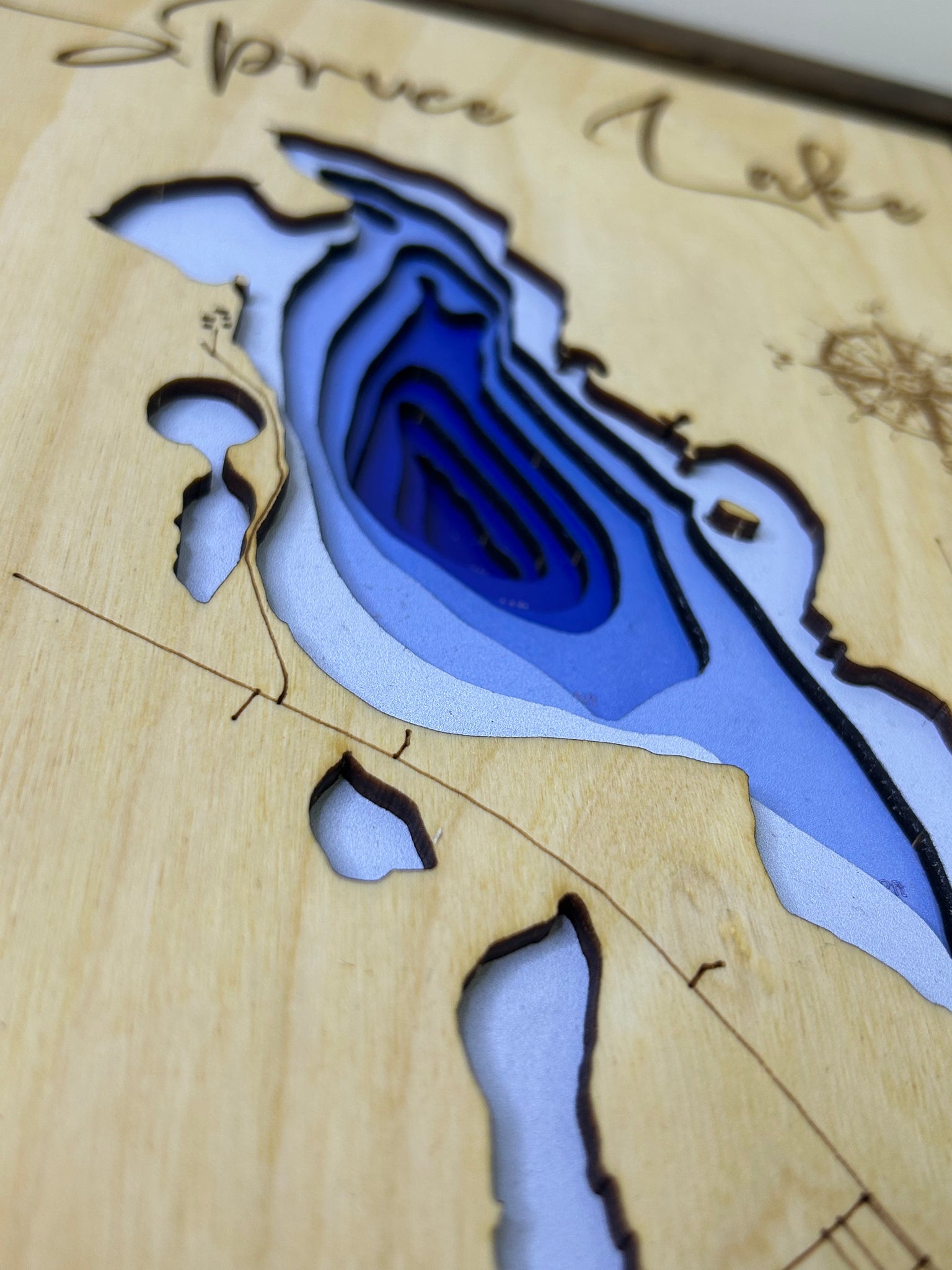 This handcrafted layered map features 8 precisely laser-cut layers in vibrant colours, capturing the depth and beauty of Spruce Lake . Each piece is hand-assembled and set in a high-quality wooden frame with a solid back panel, ready to hang on your wall.