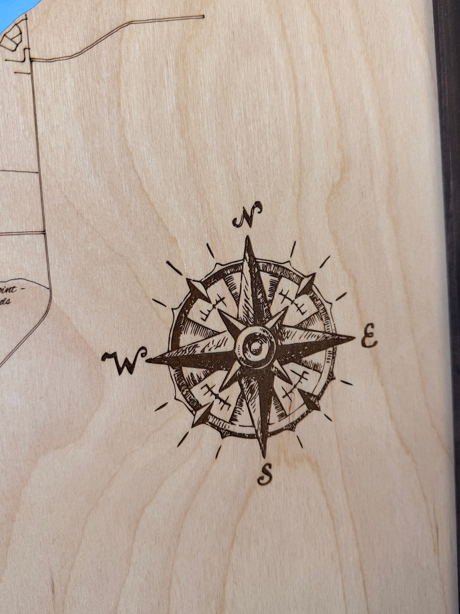 Every layer has been individually cut, sanded, airbrushed, assembled, and map framed by hand. This is the first Extra Large Turtle Lake map ever produced, making it a unique opportunity for collectors or anyone connected to the lake.