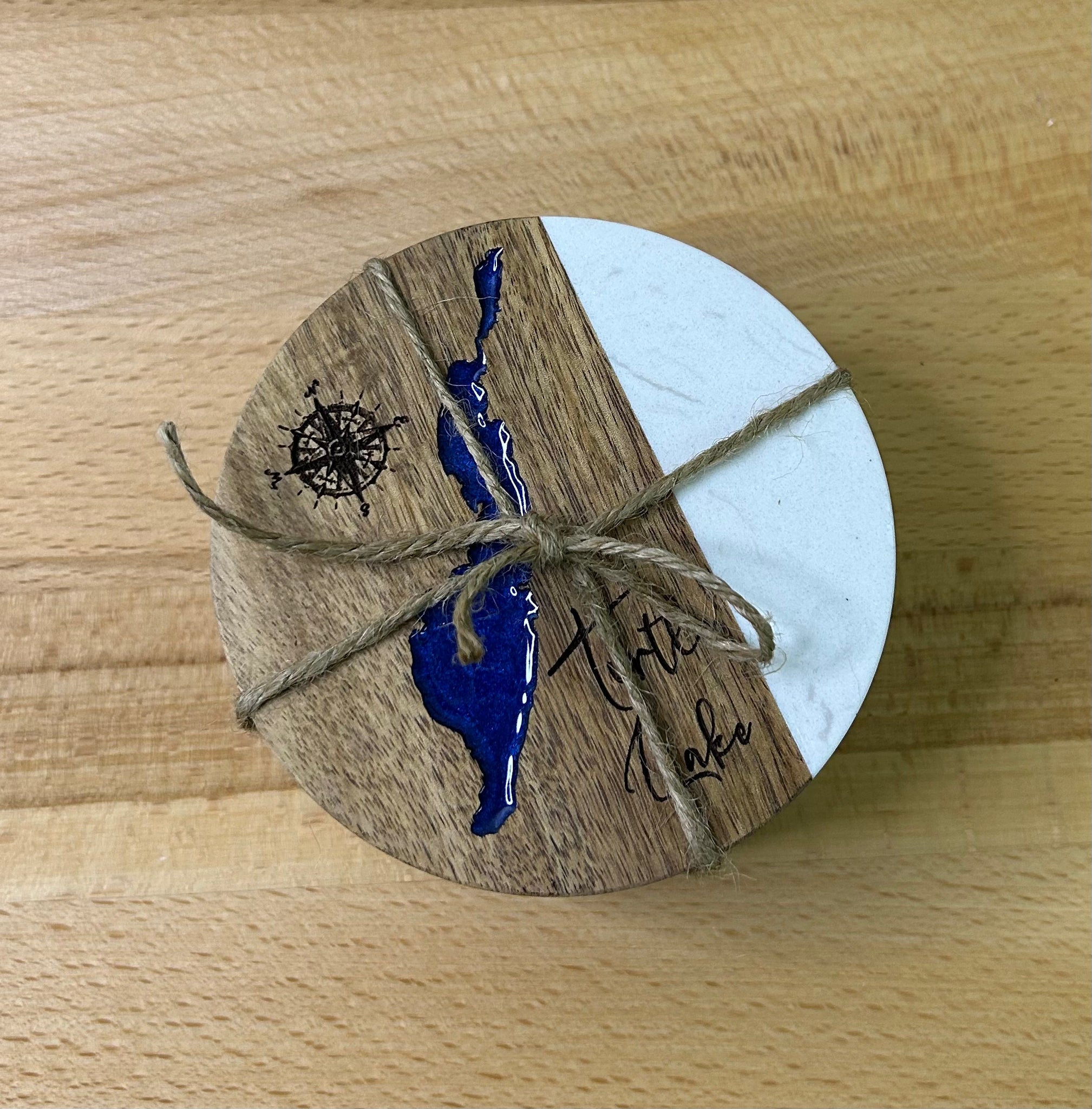 Add a rustic yet elegant touch to your space with this handcrafted Turtle Lake coasters. 4-inch round coaster features a beautiful combination of natural wood and stone, divided with a striking resin inlay that captures the unique shape of Turtle Lake in vivid, shimmering blue epoxy. The design is accented with an engraved compass rose and elegant lettering, making it both a functional piece and a conversation starter.