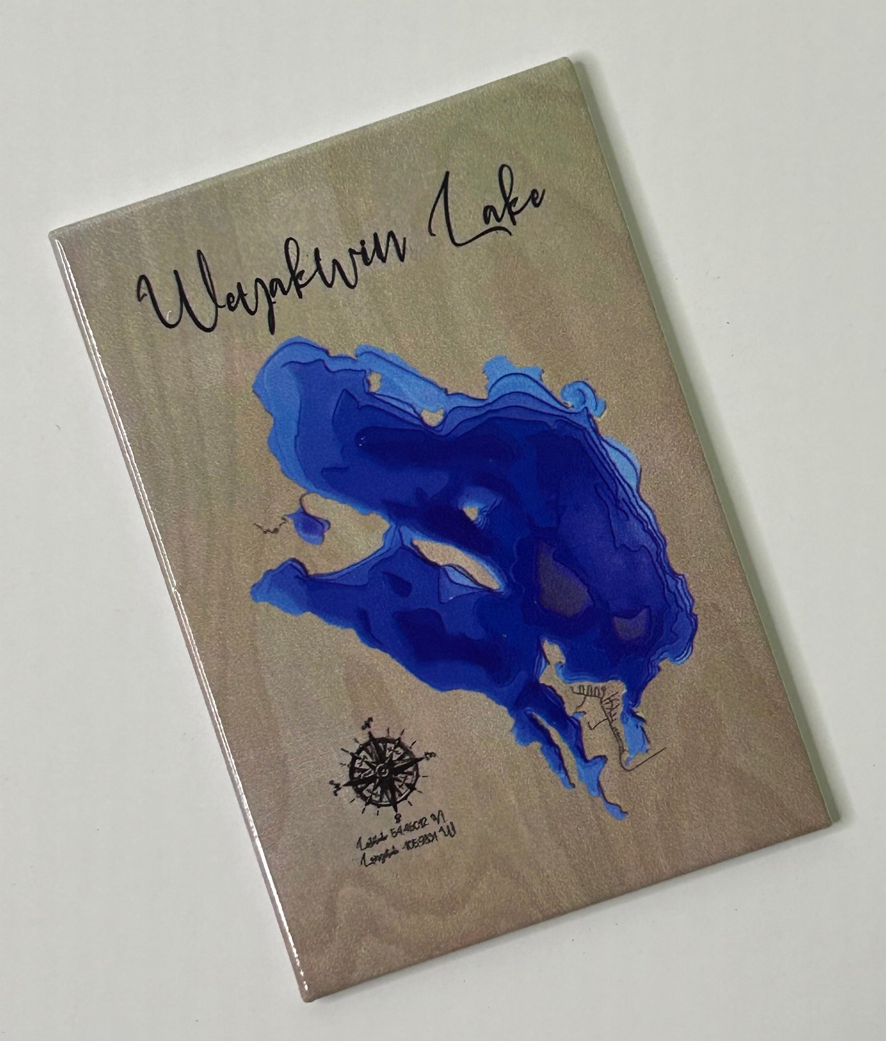 Crafted with precision using UV printing, this magnet captures the lake’s natural shape, surrounding road layout, and a decorative compass for a unique touch. The shimmering background adds a rustic yet modern appeal.